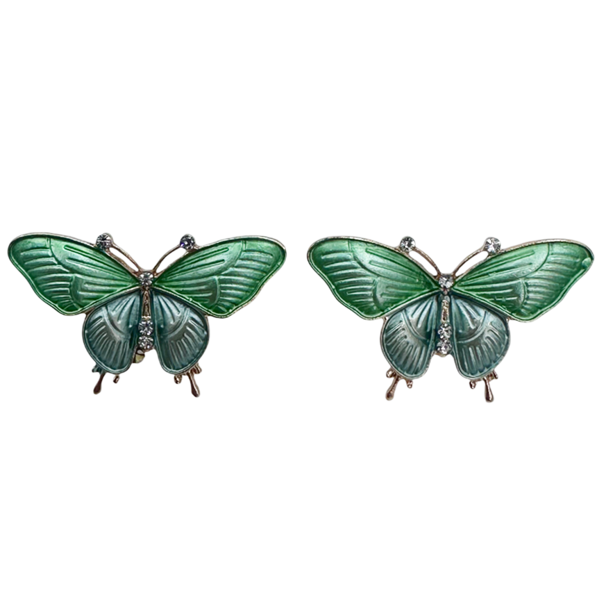 Cercei verzi în formă de fluture, emailați, cu detalii strălucitoare fine.