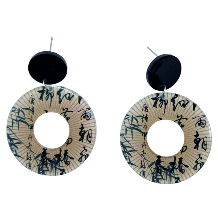 Acești cercei rotunzi impresionează prin contrastul dintre liniile grafice radiale și motivul delicat de bambus, creând un accesoriu cu aer artistic și echilibrat. Designul decupat în centru adaugă lejeritate vizuală, iar combinația de tonuri calde și accente negre îi face ușor de integrat în ținute moderne sau minimaliste.