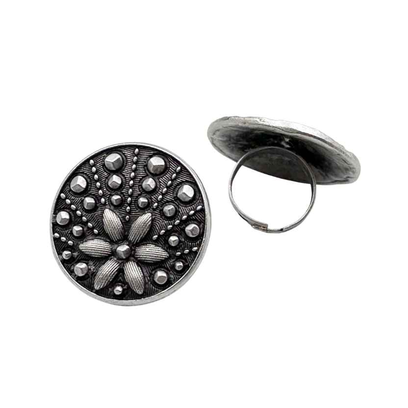 Inel de damă realizat din zamac, cu design circular și relief floral.