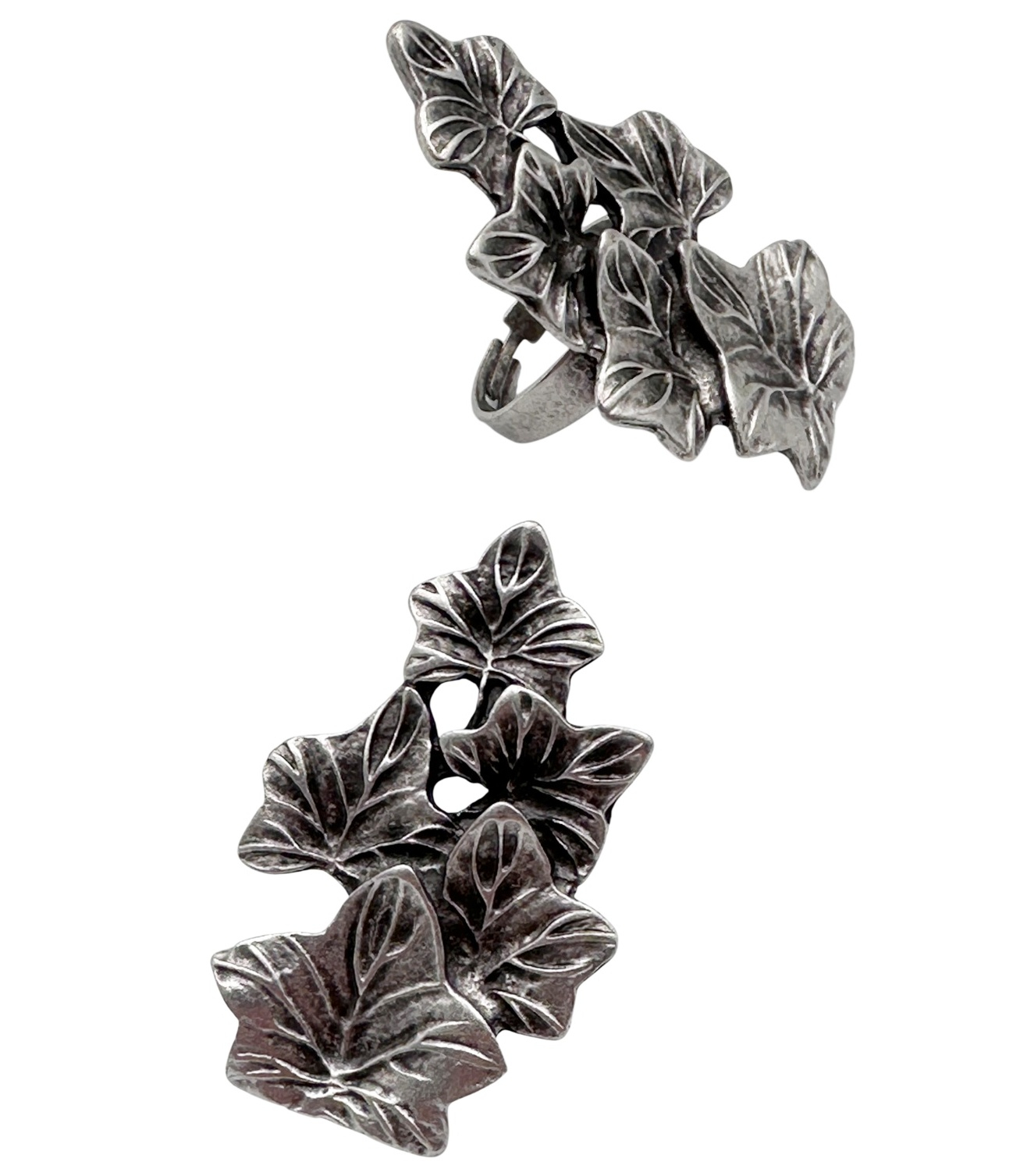 Inel de damă realizat din zamac, decorat cu frunze stilizate în relief și finisaj argintiu antichizat.