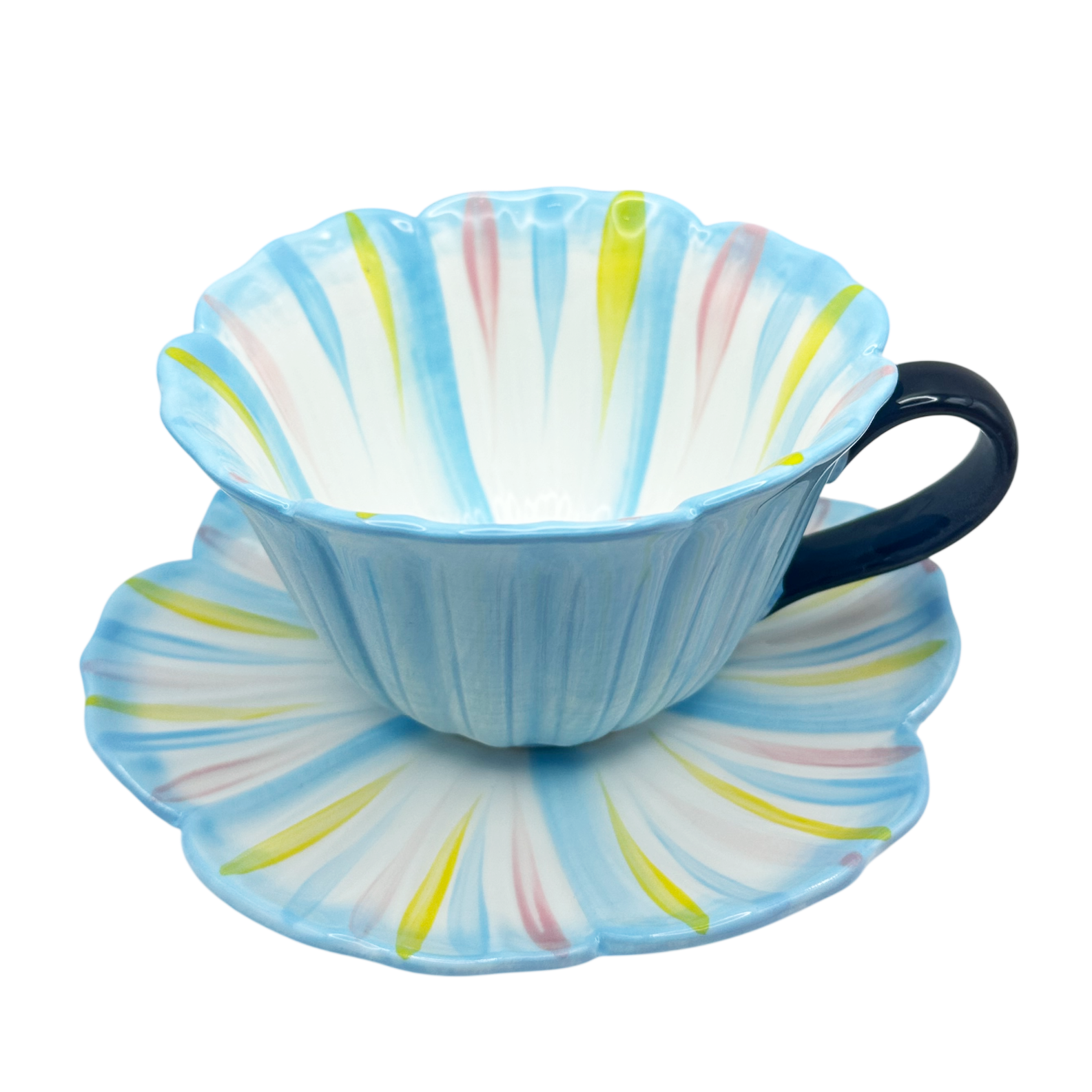 Un set rafinat și luminos, inspirat de formele delicate ale unei flori. Ceașca și farfurioara impresionează prin nuanțele pastel de albastru, completate de accente subtile în galben și roz, care adaugă un aer vesel și elegant.