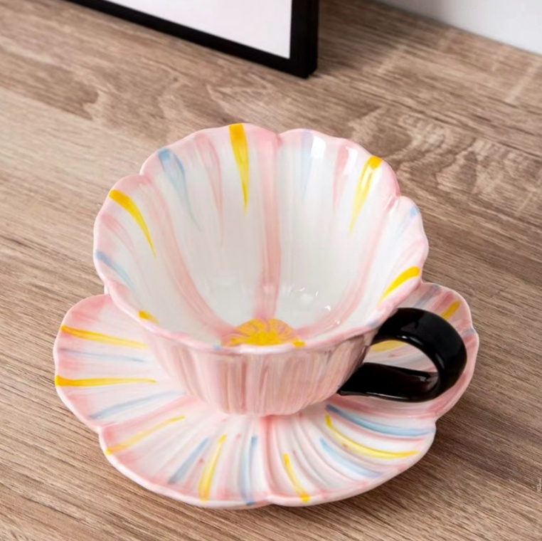 Un set rafinat și luminos, inspirat de formele delicate ale unei flori. Ceașca și farfurioara impresionează prin nuanțele pastel de roz, completate de accente subtile în galben și roz, care adaugă un aer vesel și elegant.