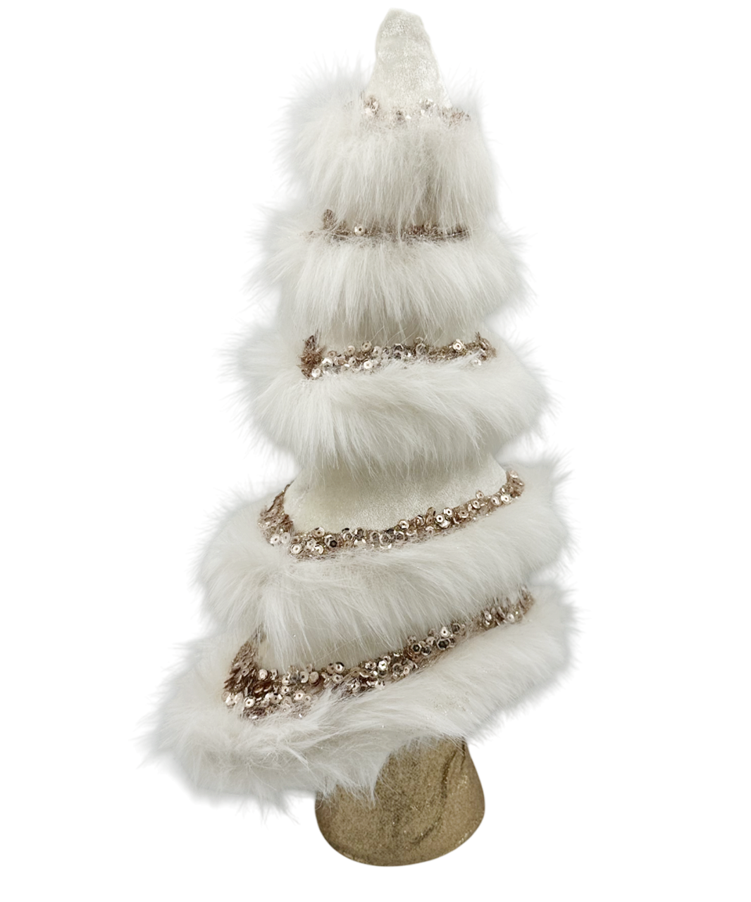 Brad decorativ elegant, îmbrăcat în blăniță albă pufoasă și decorat cu paiete sampanie fine.