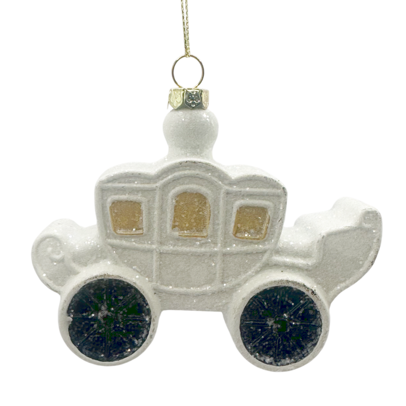 O decorațiune elegantă vintage în formă de caleasca albă, realizată din material ușor și acoperită cu sclipici fin pentru un efect magic în bradul de Crăciun.