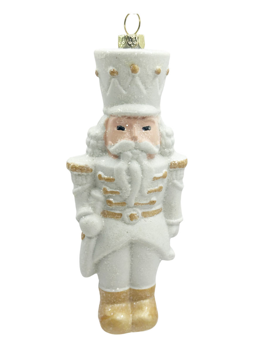 O decorațiune elegantă vintage în formă de soldatel alb, realizata din material ușor și acoperita cu sclipici fin pentru un efect magic în bradul de Crăciun.