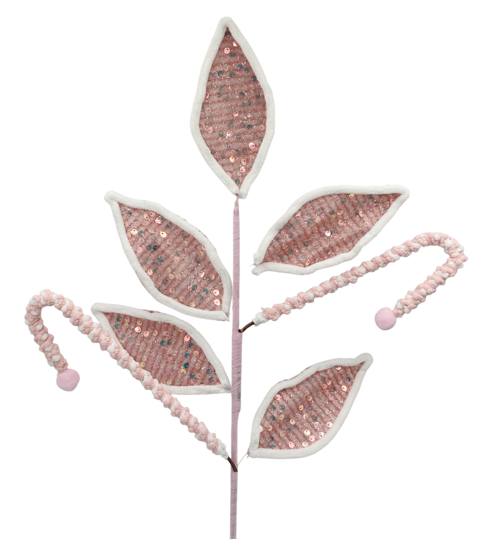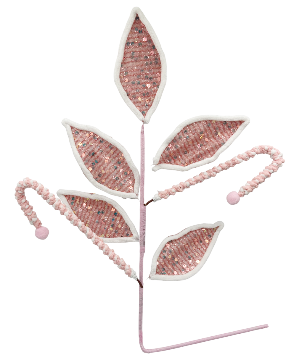 Ramură decorativă elegantă în nuanțe de roz pudrat, decorată cu paiete fine și margini albe catifelate.