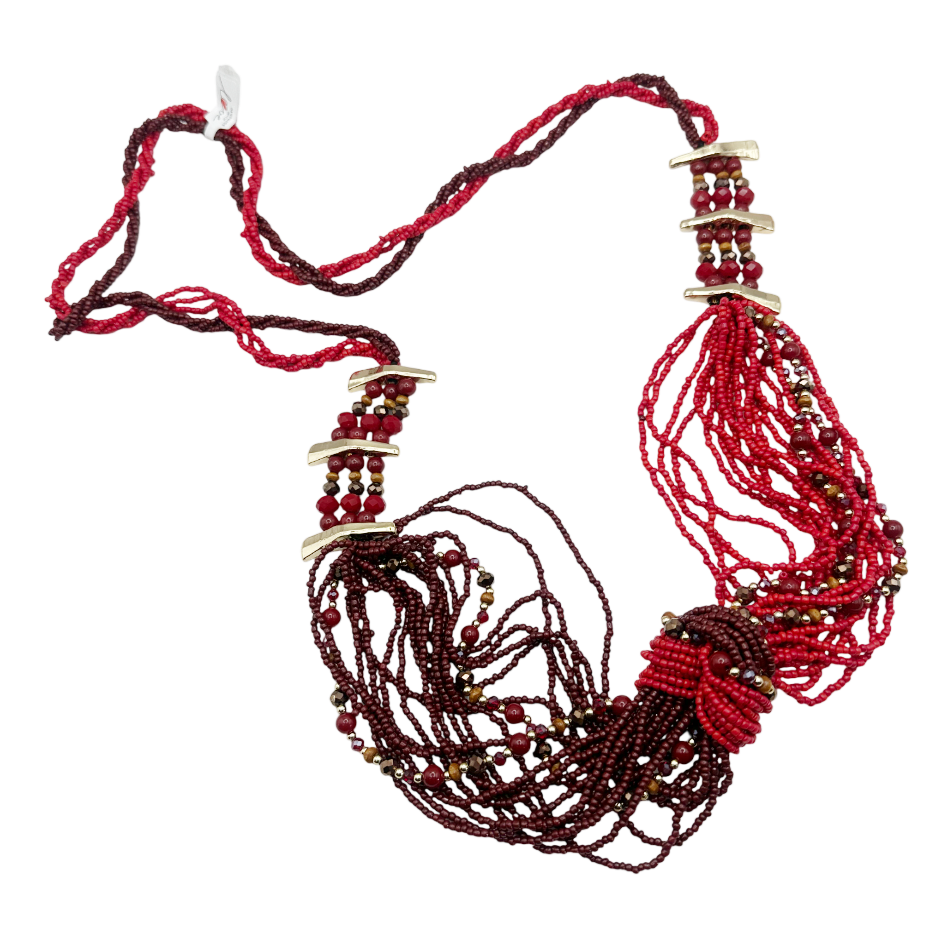 Colier lung cu mărgele MYRA, realizat manual din fire multiple de mărgele în nuanțe de roșu și vișiniu, completat cu detalii metalice aurii. Un accesoriu statement, ideal pentru a adăuga culoare și personalitate oricărei ținute.