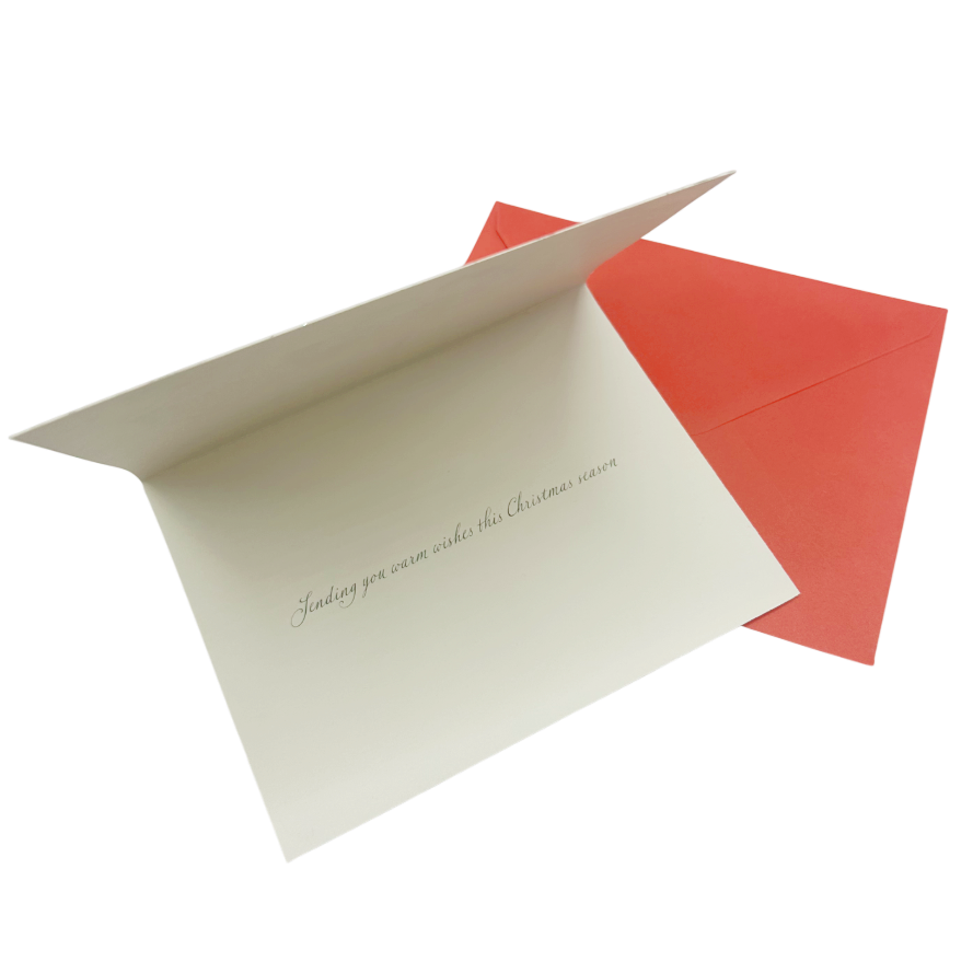O felicitare de Crăciun plină de farmecul vremurilor de altădată 🎶🏰. Ilustrația surprinde o scenă de iarnă cu o biserică luminată cald și colindători îmbrăcați de sărbătoare, sub fulgii de nea. Mesajul „Oh come all ye faithful” (Veniti, credinciosilor) evocă emoția colindelor și bucuria Crăciunului trăit în familie și comunitate. Include un plic roșu elegant, fiind perfectă pentru a transmite urări sincere celor dragi sau pentru a completa un cadou cu un strop de tradiție și emoție.