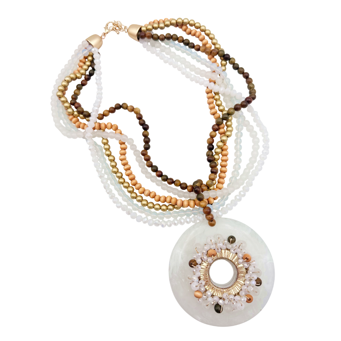 Un colier rafinat, ce impresionează prin designul său multistrat și combinația armonioasă de mărgele fine în nuanțe calde și neutre. Șiragurile delicate creează volum și eleganță, iar pandantivul central alb adaugă un plus de luminozitate și stil.