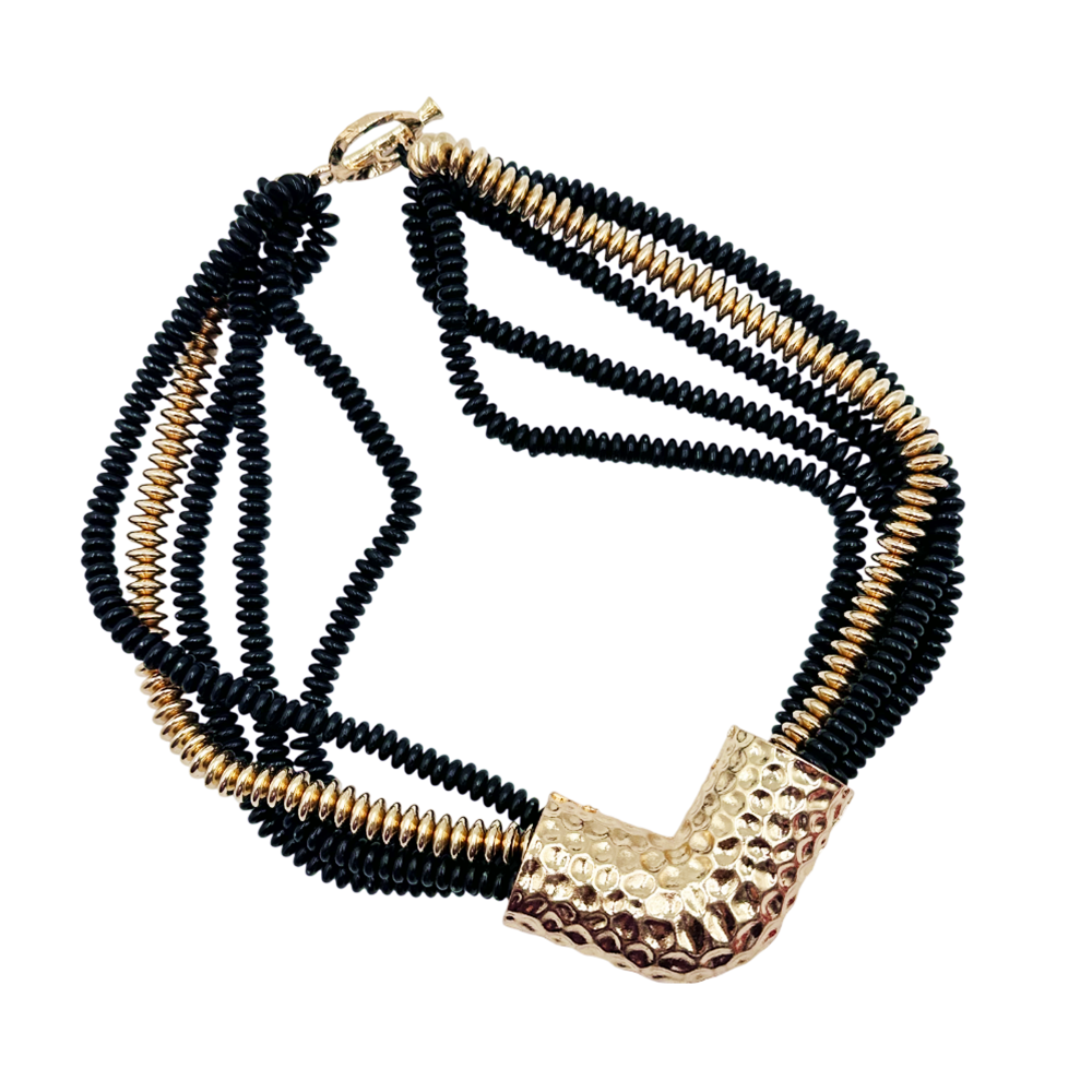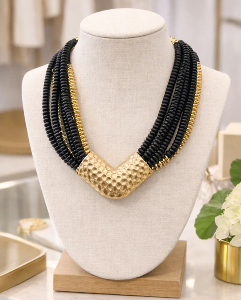 Un colier statement ce îmbină eleganța clasică cu un design contemporan. Realizat din mai multe șiraguri fine de mărgele negre, completate de accente aurii și un element central metalic cu textură decorativă, acest accesoriu atrage instant privirile.