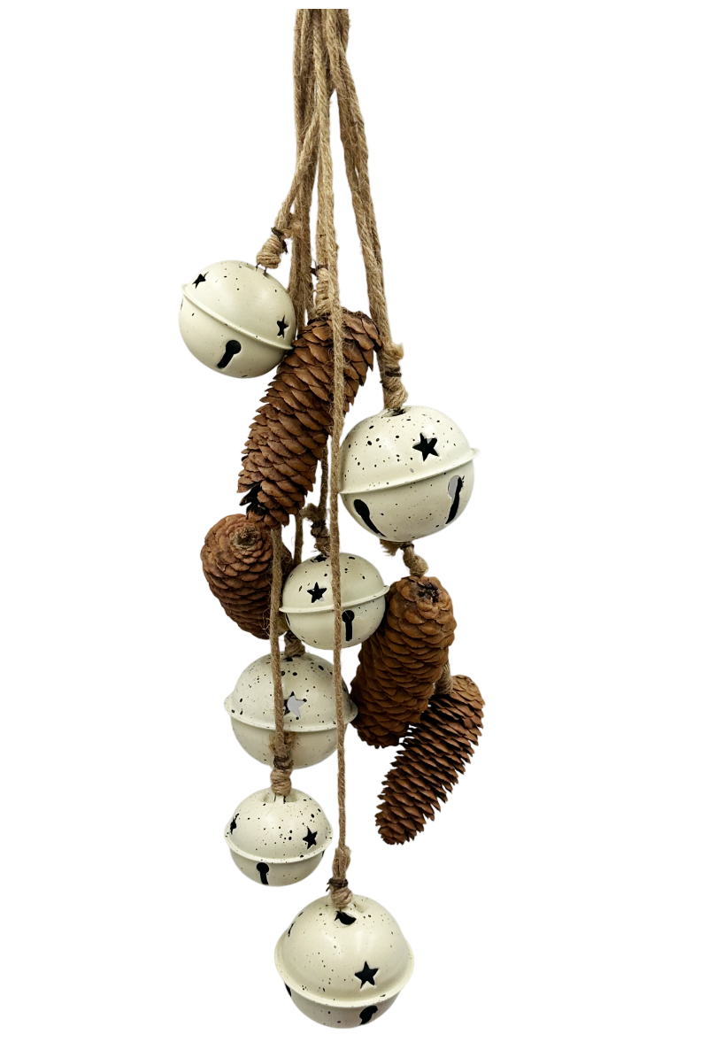 Decor rustic de agățat, realizat din sfoară naturală, clopoței metalici albi și conuri de brad. Aduce un farmec tradițional oricărui spațiu — ideal pentru uși, șeminee, ferestre sau aranjamente de iarnă. O piesă simplă și totuși plină de atmosferă festivă.
