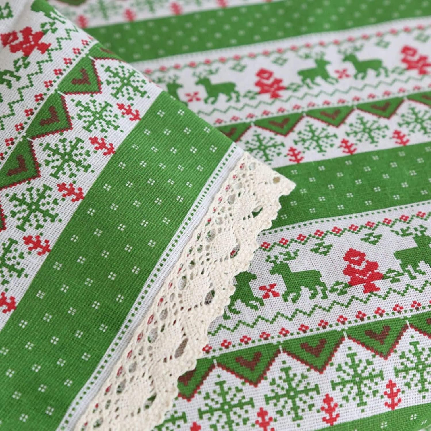 Transformă masa de sărbătoare într-un decor magic cu această față de masă de Crăciun verde, cu imprimeu festiv. Realizată din material textil rezistent, cu un design vesel ce include brăduți, reni, fulgi de zăpadă și motive tradiționale, aceasta oferă încăperii un aer cald, familial și plin de culoare.