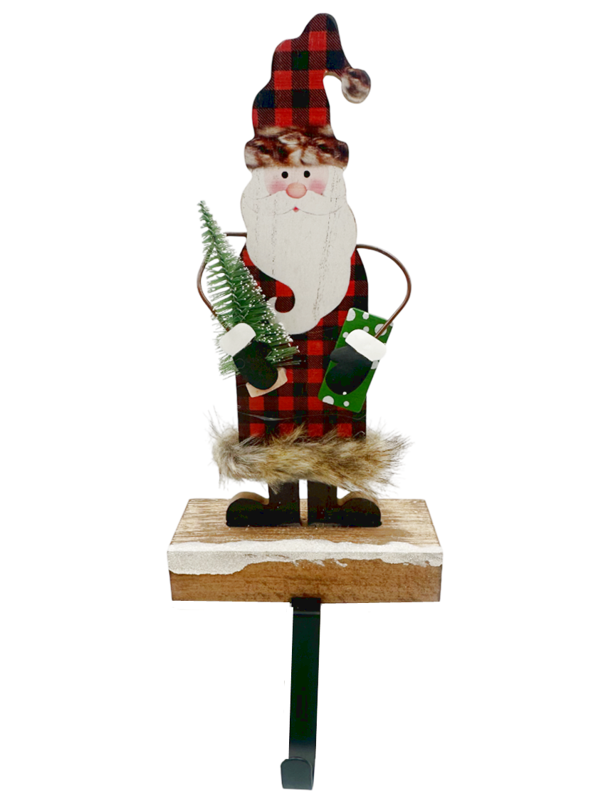 Acest suport decorativ cu Moș Crăciun îmbrăcat în carouri roșii și negre este ideal pentru a atârna șosetele de Crăciun sau alte mici decorațiuni festive.