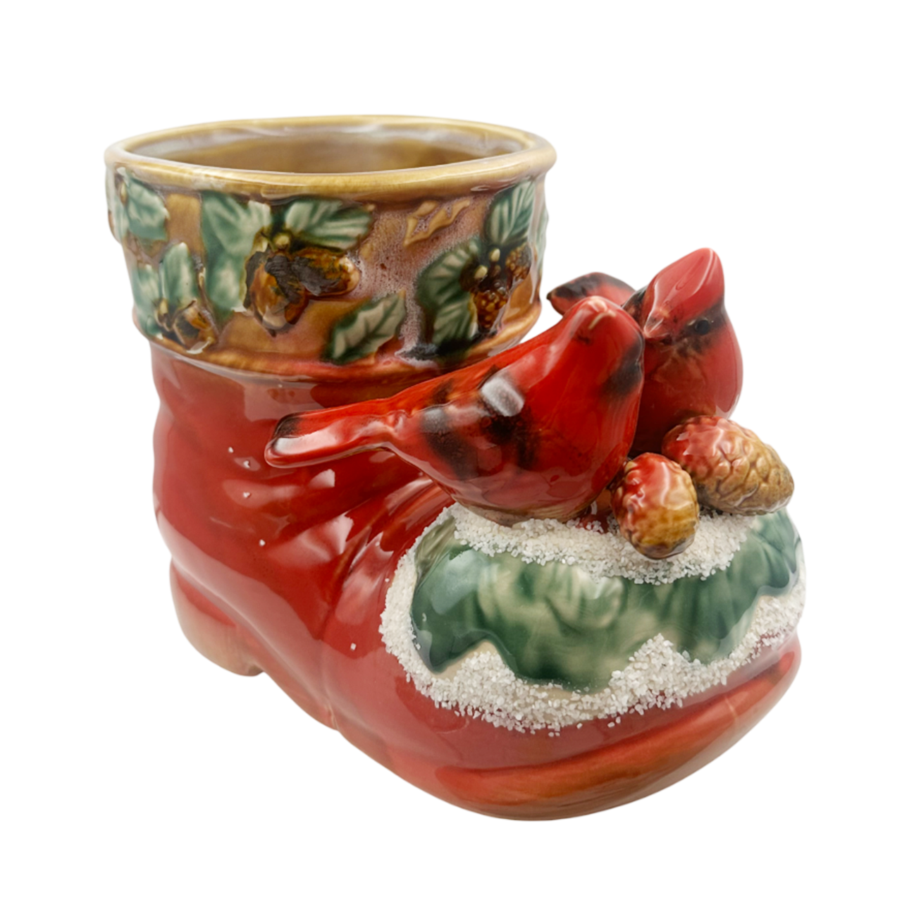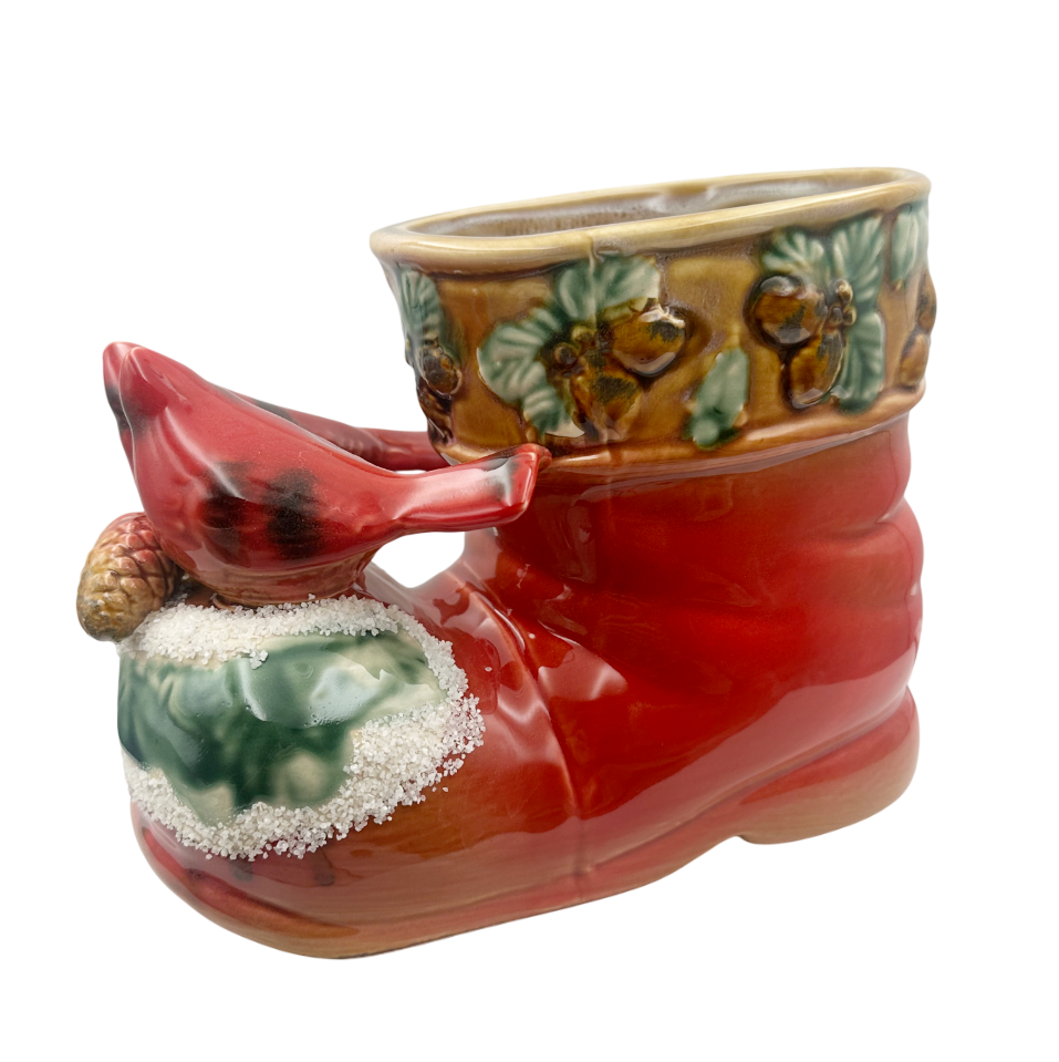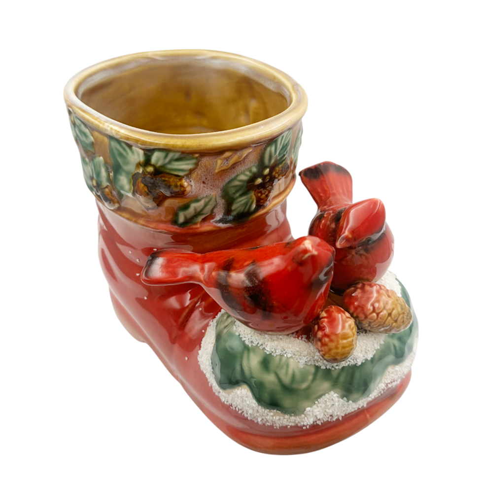 Vază ceramică în formă de cizmă roșie, decorată cu păsări, frunze de brad și conuri, cu accente fine de zăpadă artificială.