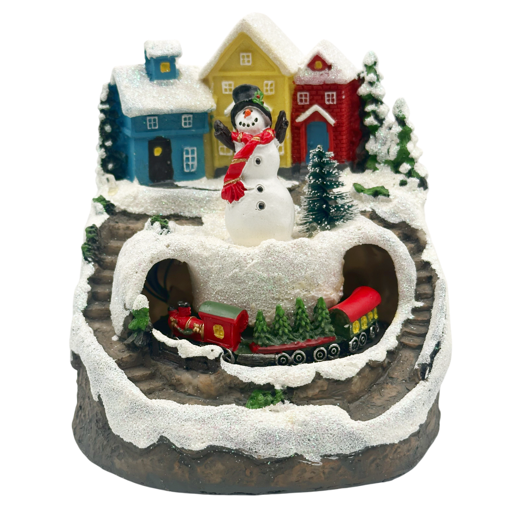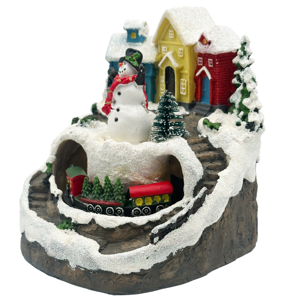 Transformă-ți decorul de sărbători într-o adevărată poveste de iarnă cu această decorațiune impresionantă, care îmbină luminile calde LED cu o coloană sonoră muzicală festivă. Scena prezintă un sat colorat acoperit de zăpadă, un om de zăpadă vesel și un trenuleț roșu care se mișcă printr-un tunel sculptat în „munte”, creând un efect magic și dinamic.