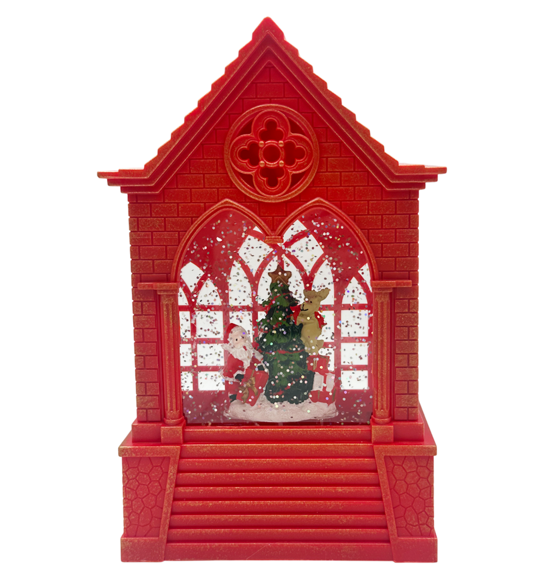 Această decorațiune de Crăciun combină luminile LED calde, muzica festivă și un superb efect sclipici care imită ninsoarea, pentru a crea o scenă spectaculoasă cu Moș Crăciun și bradul împodobit.