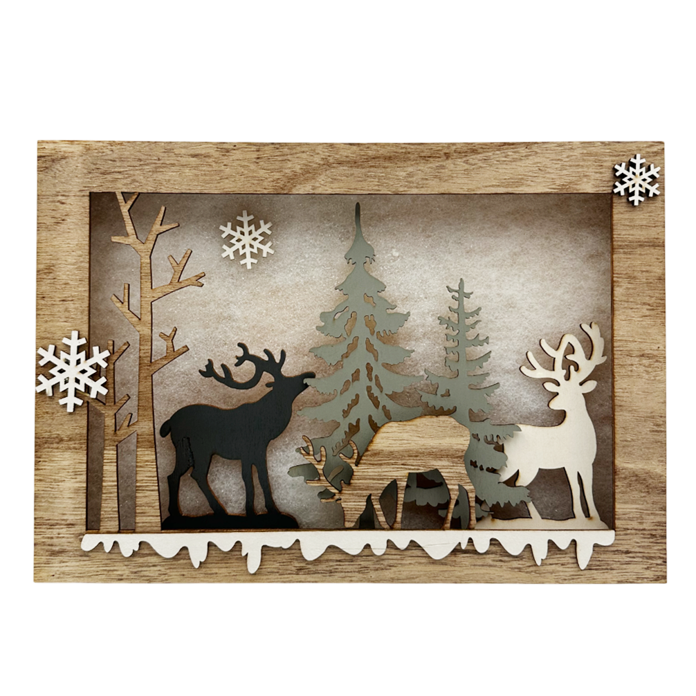 Acest tablou decorativ din lemn, prevăzut cu LED-uri calde, aduce farmecul iernii direct în casa ta. Designul 3D redă o pădure liniștită cu brazi și reni decupați delicat, completată de fulgi de zăpadă ornamentali și un fundal în nuanțe naturale. Atunci când LED-urile sunt aprinse, scena capătă profunzime și o strălucire magică, perfectă pentru atmosfera sărbătorilor.