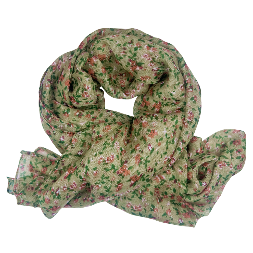Eșarfă delicată din vascoză, cu imprimeu floral fin pe fundal kaki