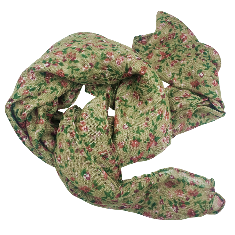 Adaugă un strop de prospețime ținutelor tale cu această eșarfă din vascoză - Esarfa cu flori LUCILLE -, într-o nuanță elegantă de kaki, decorată cu un imprimeu floral discret și feminin.