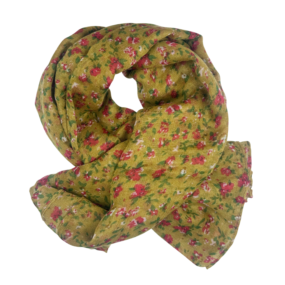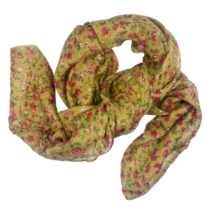 Adaugă un strop de prospețime ținutelor tale cu această eșarfă din vascoză - Esarfa cu flori LUCILLE -, într-o nuanță elegantă de maro-auriu, decorată cu un imprimeu floral discret și feminin.