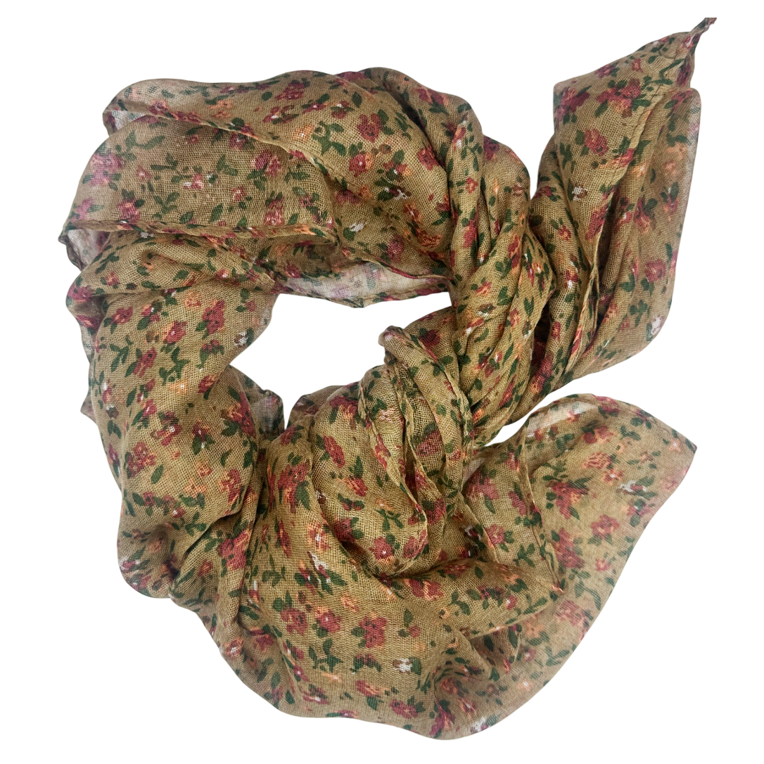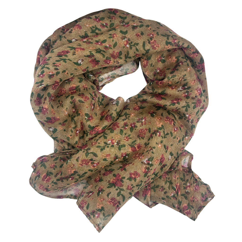 Adaugă un strop de prospețime ținutelor tale cu această eșarfă din vascoză - Esarfa cu flori LUCILLE -, într-o nuanță elegantă de maro-deschis, decorată cu un imprimeu floral discret și feminin.