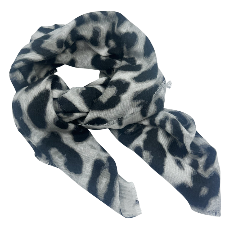 Eșarfă de damă cu imprimeu animal print, subtire, în nuanțe elegante de gri și negru.