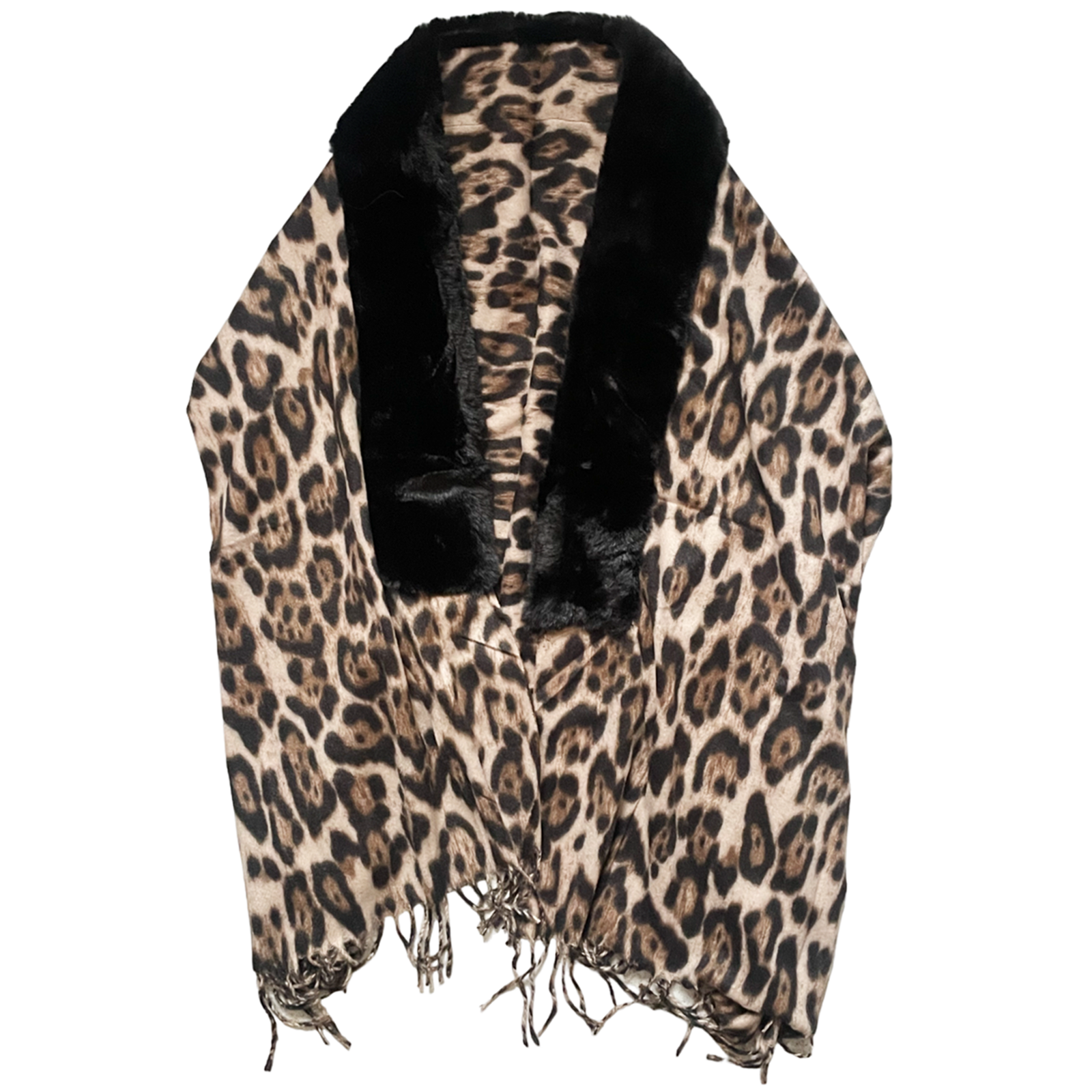Esarfa tip Poncho cu blanita si franjuri Cashmere LEOPARD, Maro/ Negru