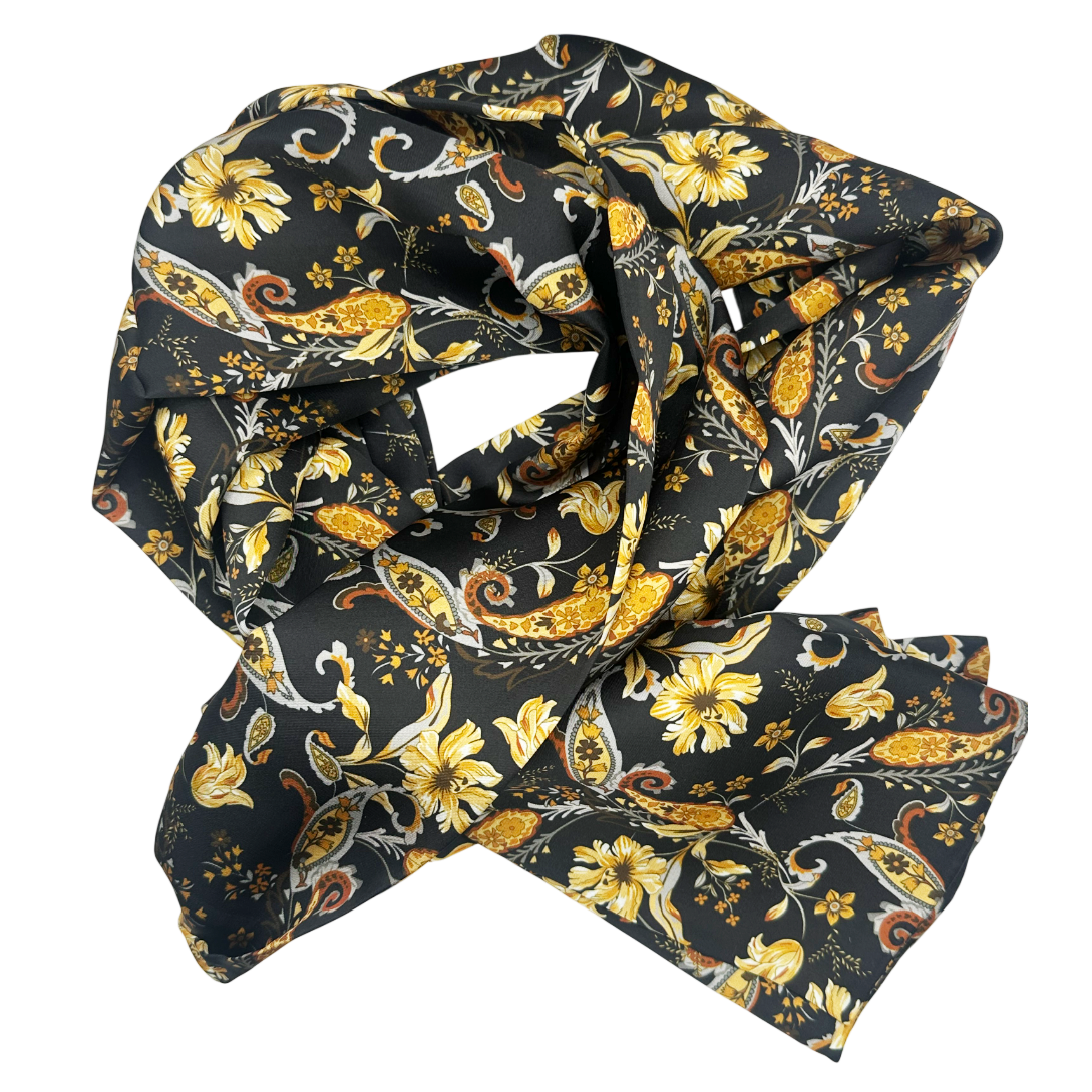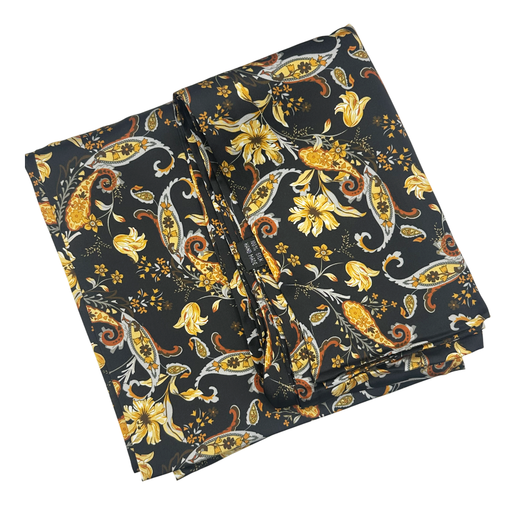 Eșarfă elegantă pentru bărbați, realizată din material fin, cu fundal negru și imprimeu floral sofisticat în nuanțe de galben, auriu și gri.