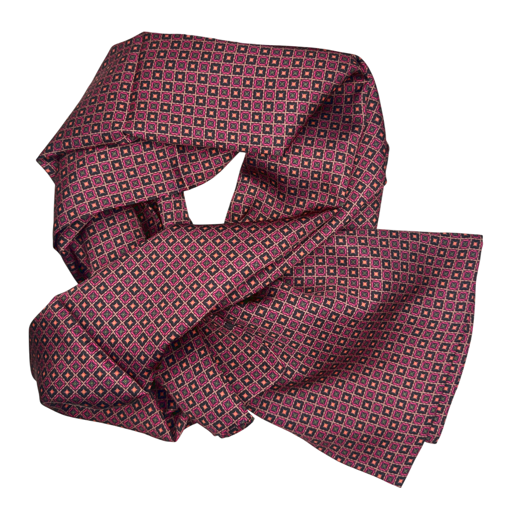 Eșarfă rafinată pentru bărbați, confecționată din material moale și lucios, în nuanță fucsia intens cu model geometric subtil în tonuri contrastante.