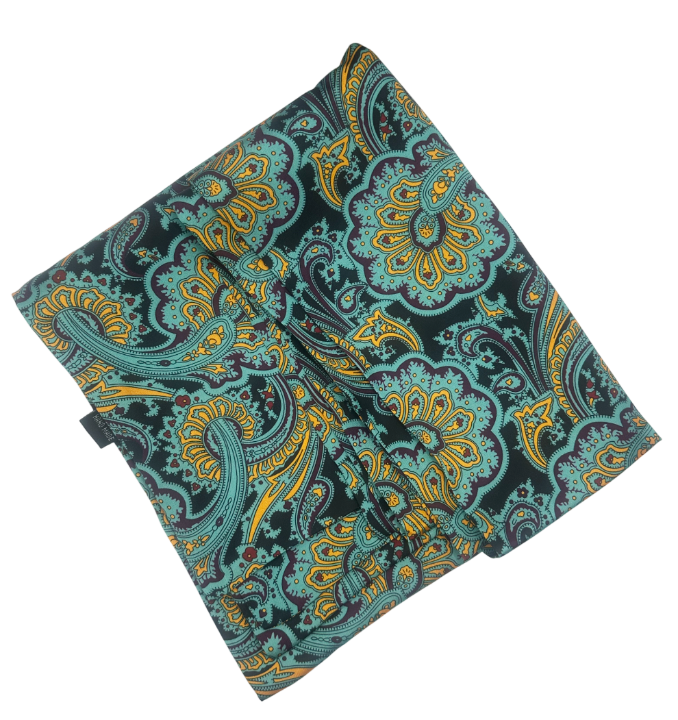 Eșarfă din mătase naturală, lucrată manual, cu un imprimeu paisley sofisticat în nuanțe de turcoaz, auriu și negru.
