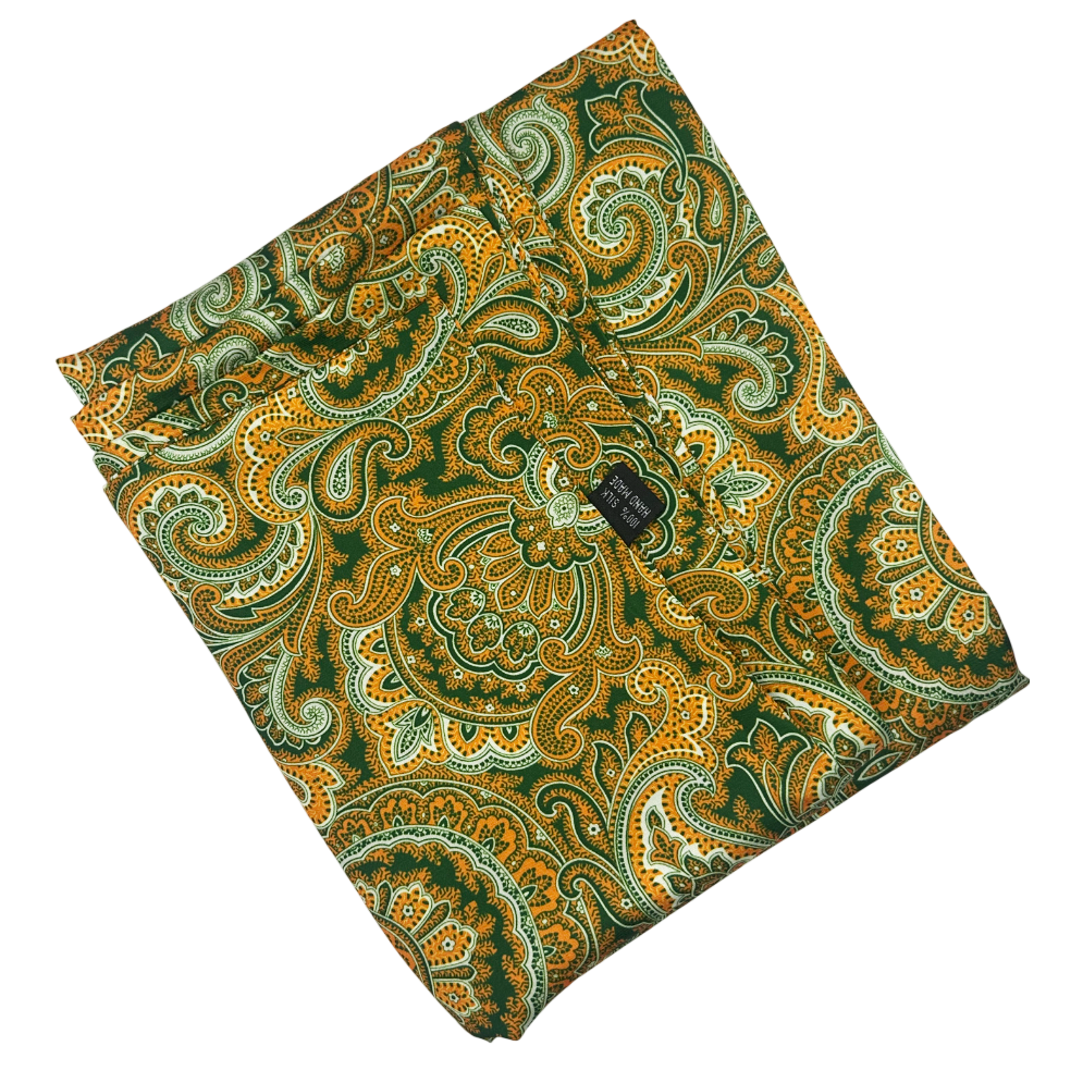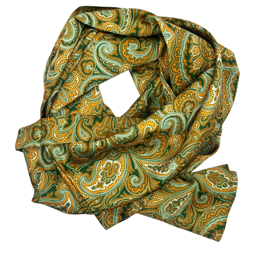 Eșarfă elegantă pentru bărbați, din material fin și lucios, în nuanțe de verde, portocaliu și alb, cu imprimeu paisley clasic. Un accesoriu rafinat și plin de personalitate, perfect pentru ținute elegante sau casual cu stil distinct.