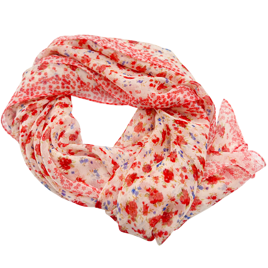 Fondul rosu-inchis intens scoate în evidență imprimeul floral mărunt în nuanțe de roz și verde, oferind un contrast plăcut și ușor de asortat. Materialul fin, cu aspect vaporos și ușor transparent, adaugă lejeritate si delicatete oricărei ținute.