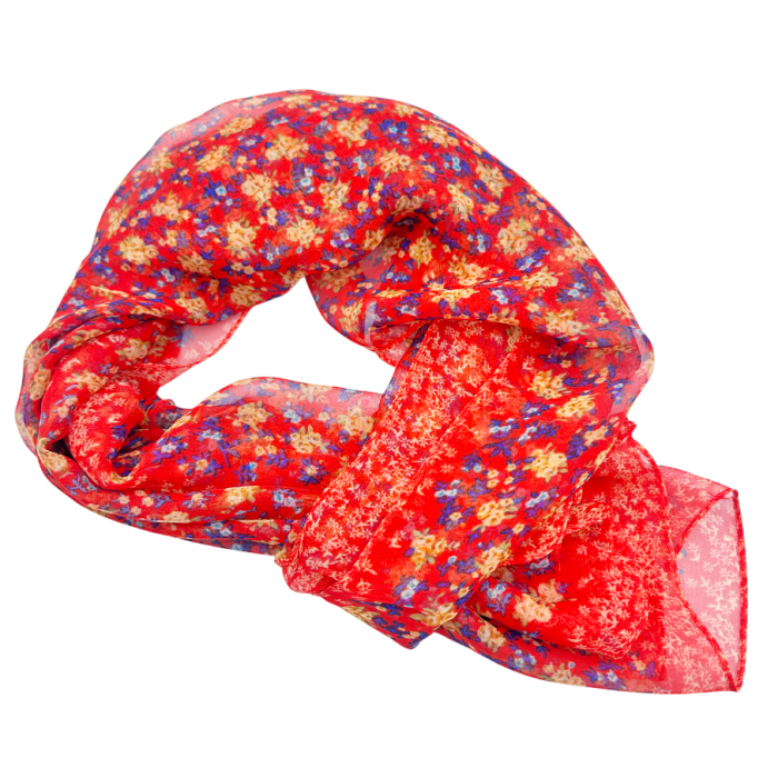 Elegantă și delicată, această eșarfă rosie cu imprimeu floral galben-albastru este accesoriul ideal pentru un look feminin și rafinat.