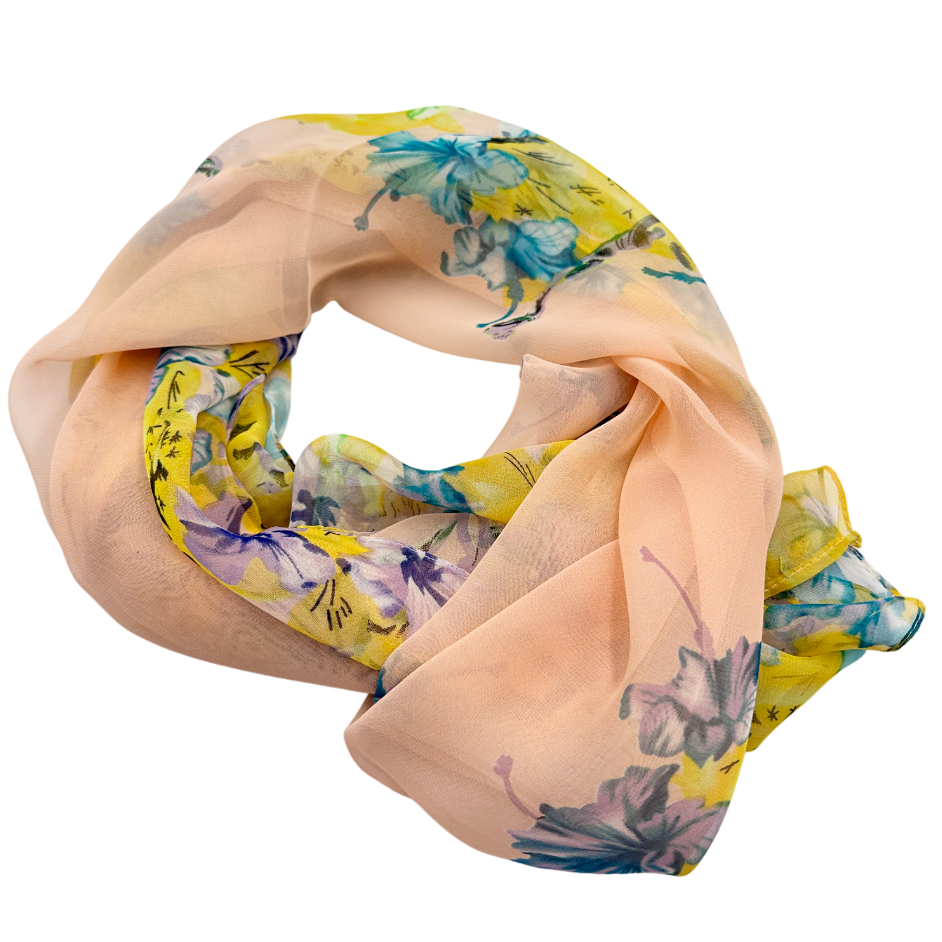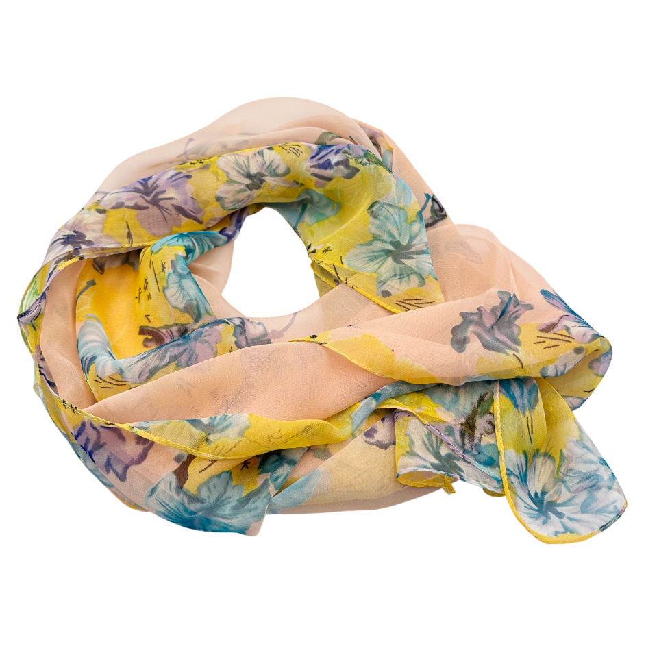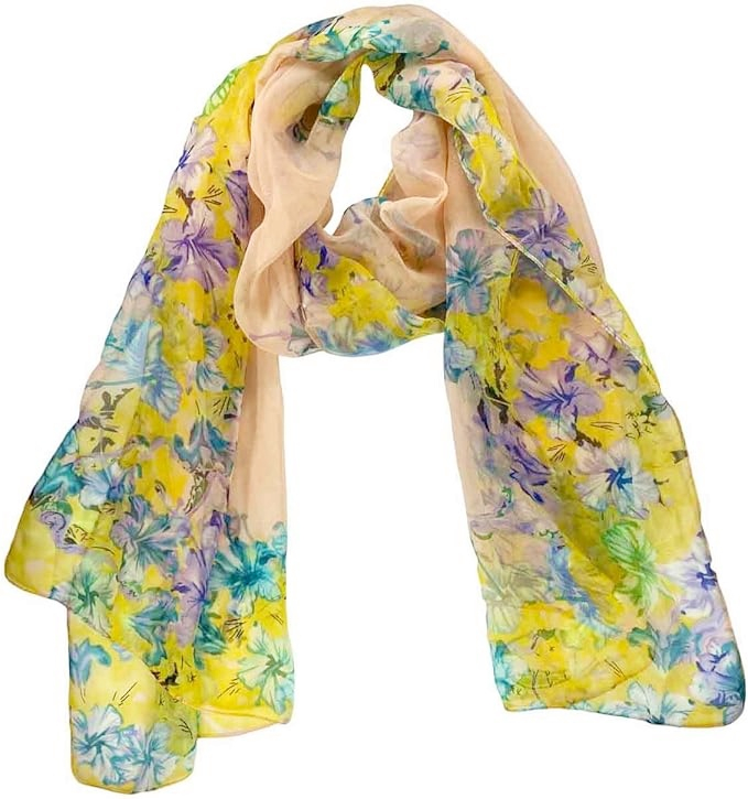 Cu un imprimeu floral romantic în nuanțe de galben si albastru, eșarfa adaugă prospețime și rafinament, fiind potrivită atât pentru ținute casual, cât și pentru outfituri elegante.