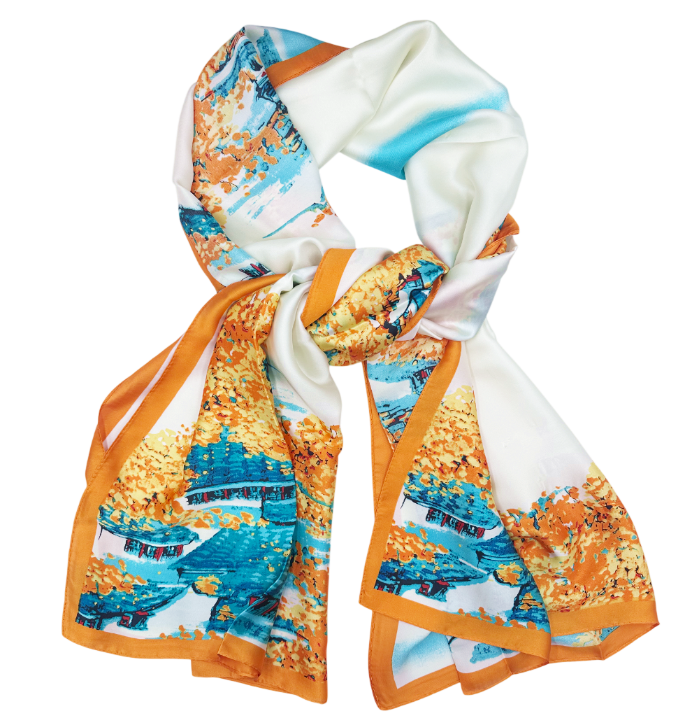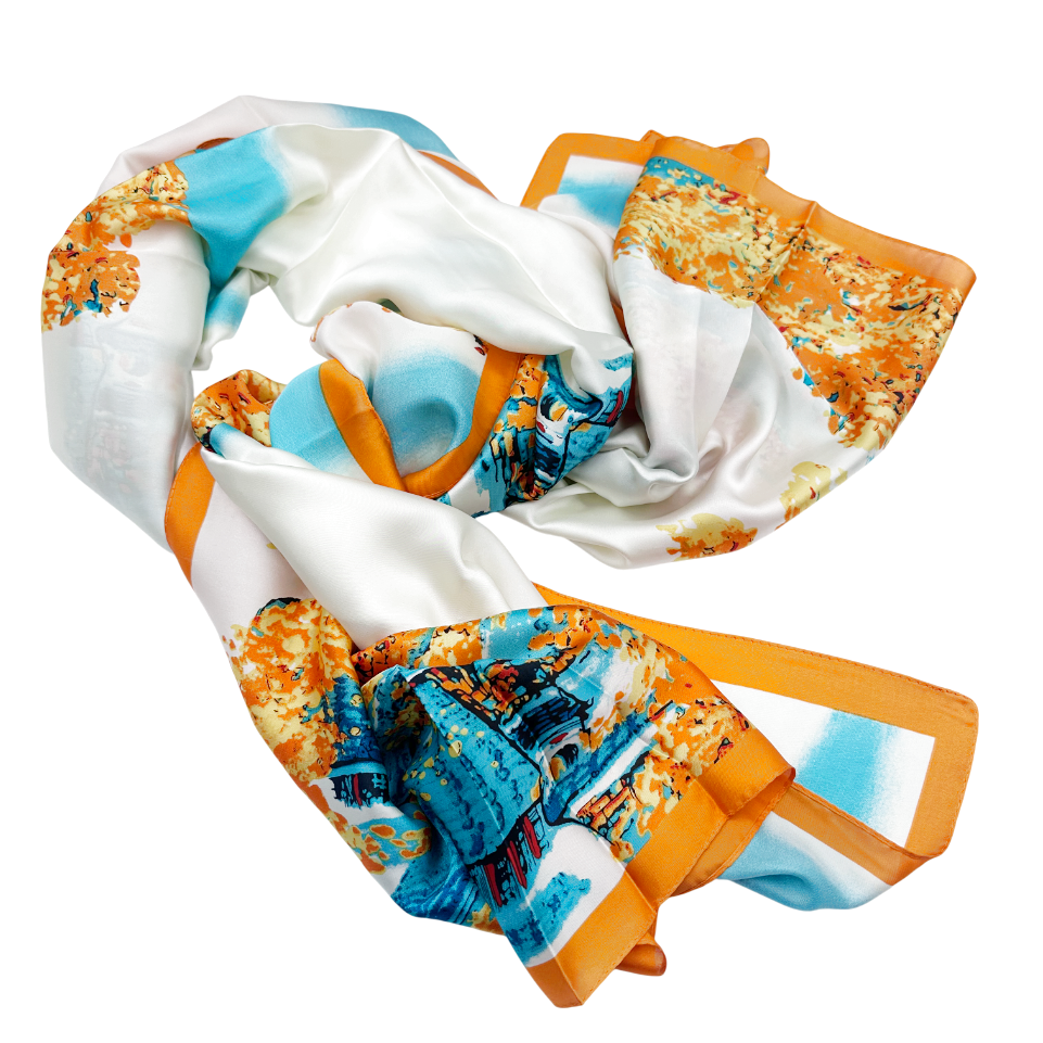 Esarfa dama PATRICE cu peisaj, Alb/ Portocaliu, Matase, 90x180cm