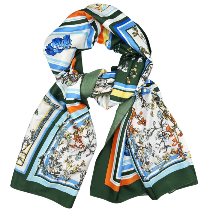 Esarfa matase FLORES cu flori si motive geomterice, Verde, 85x180cm