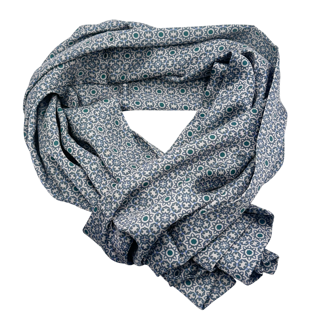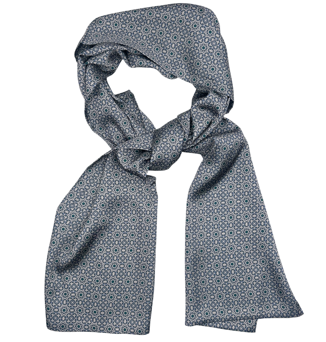 Eșarfă din mătase naturală, realizată manual, cu un model geometric rafinat în nuanțe de gri, verde și albastru închis. Materialul fin și luciul delicat al mătăsii oferă confort și eleganță, transformând-o într-un accesoriu ideal pentru orice ținută sofisticată. O alegere inspirată pentru bărbatul care apreciază calitatea și stilul clasic.
