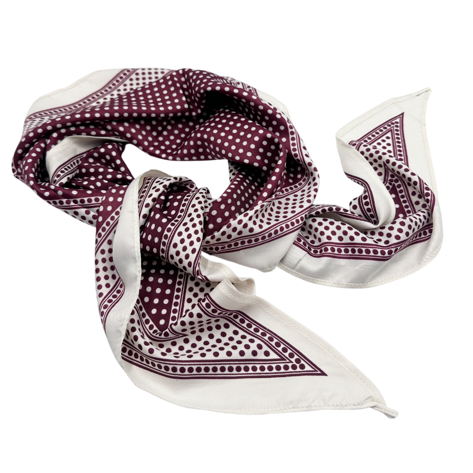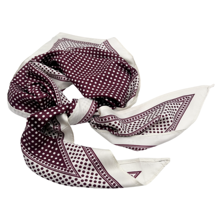 Eșarfa VICTORIA aduce un aer modern și versatil prin combinația clasică de bordo și alb, completată de un imprimeu cu buline rafinate. Forma triunghiulară o face ușor de purtat în multiple stiluri, fiind un accesoriu practic și elegant pentru orice sezon