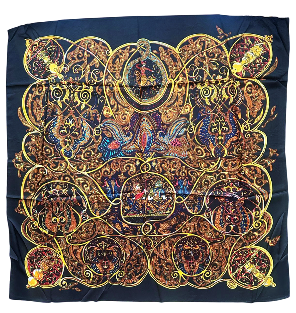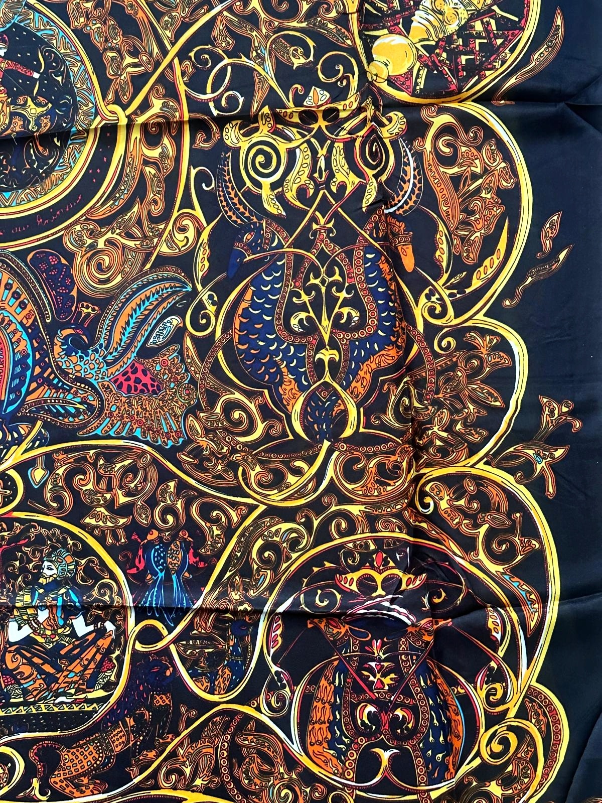 Eșarfă elegantă din mătase, cu imprimeu artistic bogat, cu flori și cu păsări, în nuanțe vibrante de negru si galben-auriu. Un accesoriu statement, ideal pentru ținute rafinate și apariții memorabile.