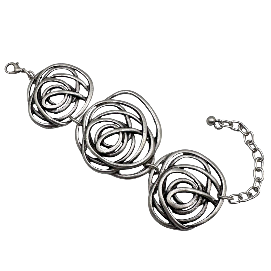 Brățară realizată din elemente circulare cu spirale deschise, interconectate prin zale discrete.