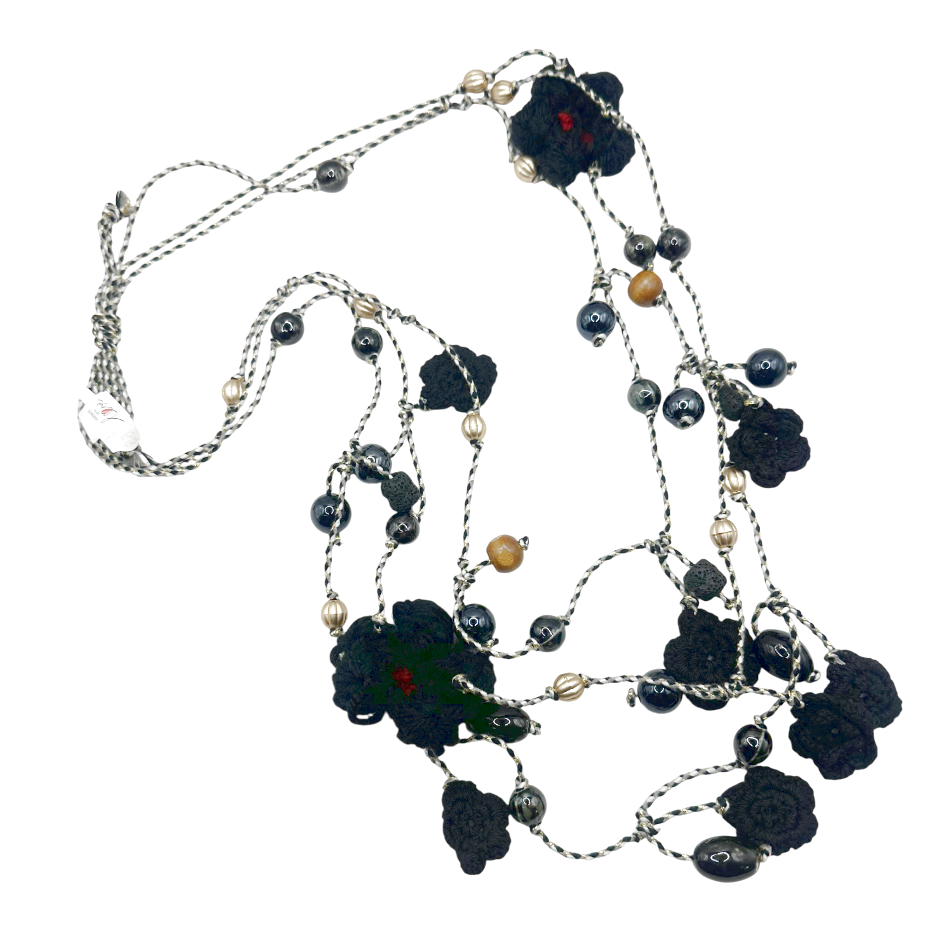 Colier lung realizat manual, cu motive florale croșetate în nuanțe de negru și margele decorative asortate. Un accesoriu original, cu aer boem, perfect pentru a adăuga un strop de natură și personalitate oricărei ținute.