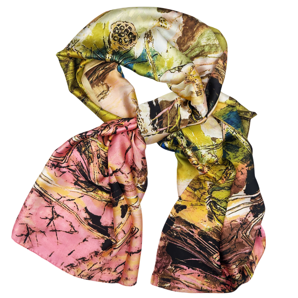 Adaugă o notă de rafinament ținutelor tale cu această eșarfă elegantă din mătase, ușoară și plăcută la atingere. Imprimeul artistic, în nuanțe calde de roz si verde, cu accente vibrante, oferă un aer sofisticat și versatil, ușor de asortat atât la ținute casual, cât și la cele elegante.