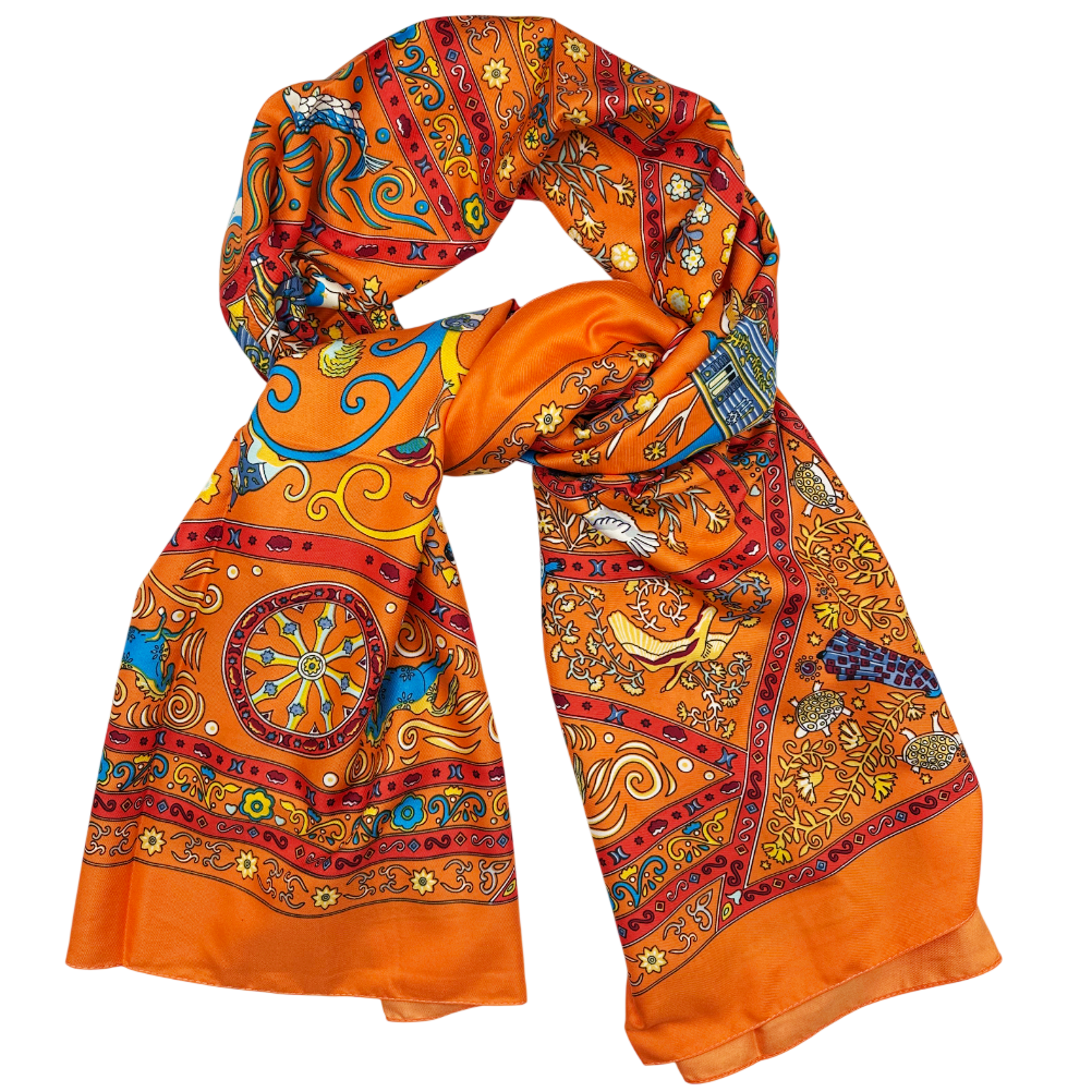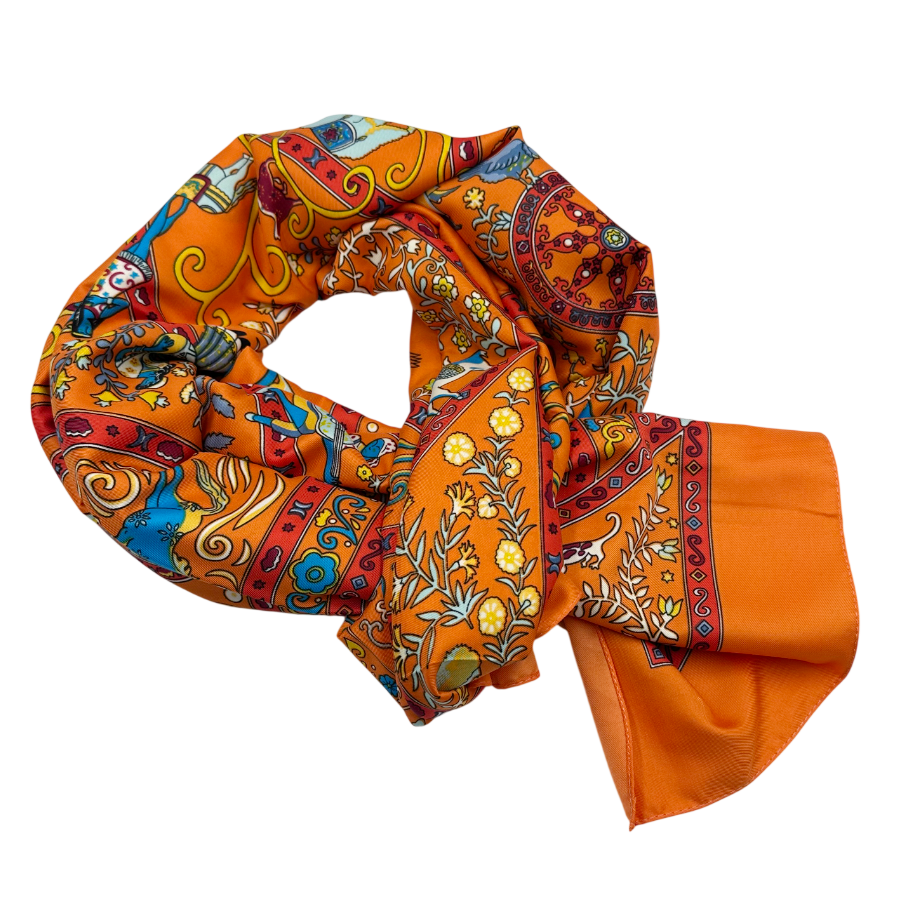 Esarfa matase MAYA cu flori si motive orientale, Portocaliu, 85x180
