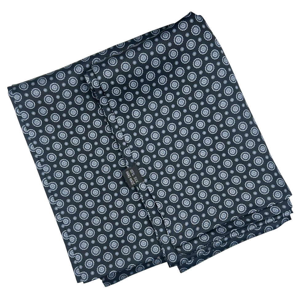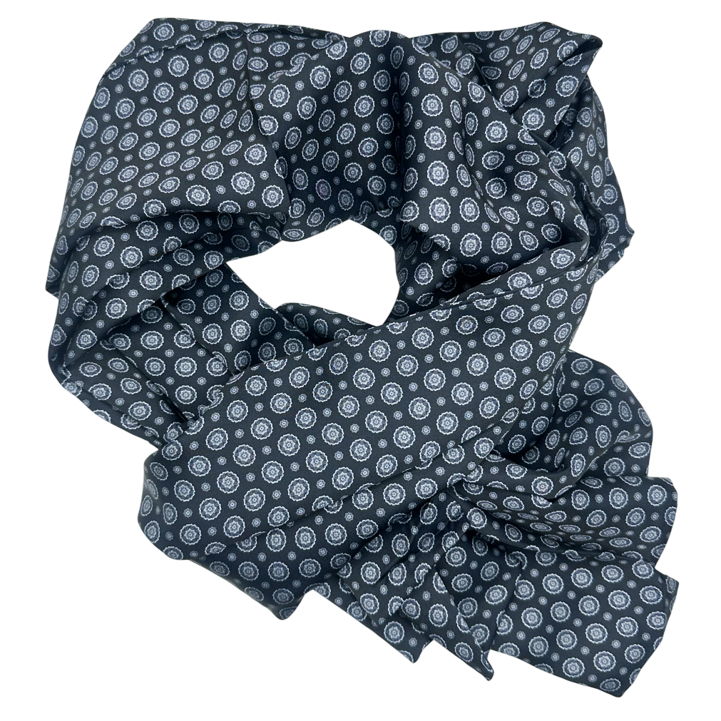 Eșarfă elegantă pentru bărbați, realizată din material fin și plăcut la atingere, în nuanță gri închis cu imprimeu circular subtil alb.