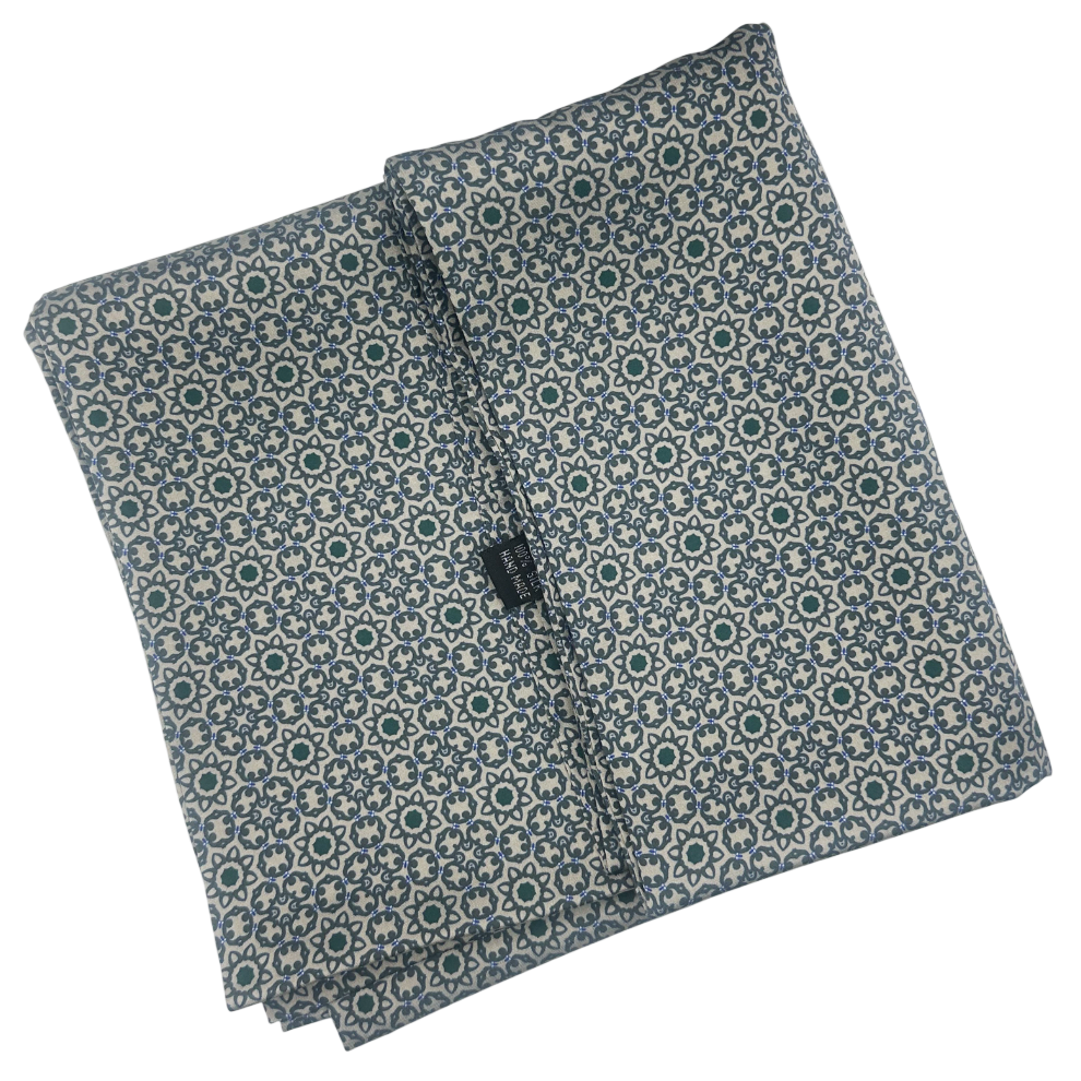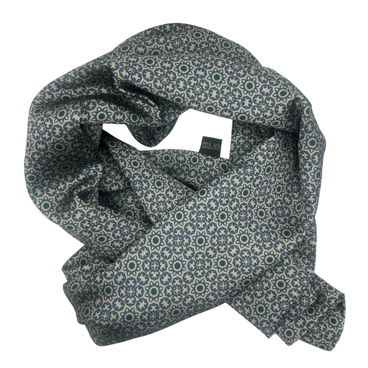 Eșarfă din mătase naturală, realizată manual, cu un model geometric rafinat în nuanțe de gri, verde și albastru închis. Materialul fin și luciul delicat al mătăsii oferă confort și eleganță, transformând-o într-un accesoriu ideal pentru orice ținută sofisticată. O alegere inspirată pentru bărbatul care apreciază calitatea și stilul clasic.