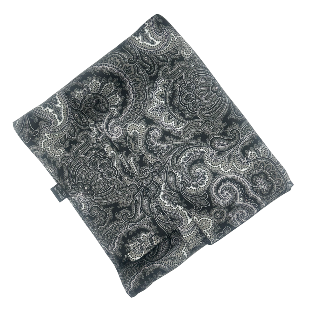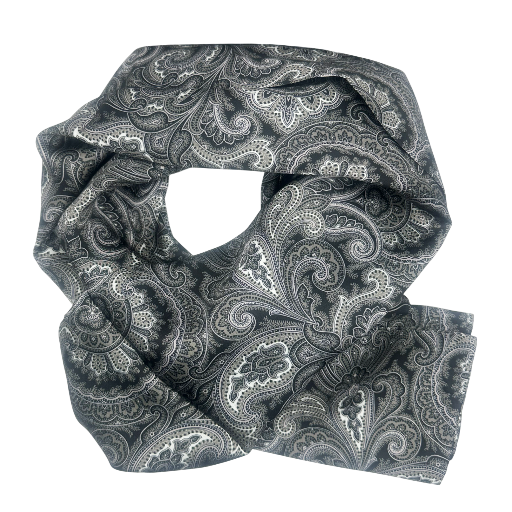 FEșarfă rafinată din mătase naturală, cu model paisley clasic în nuanțe calde de negru, alb si gri.