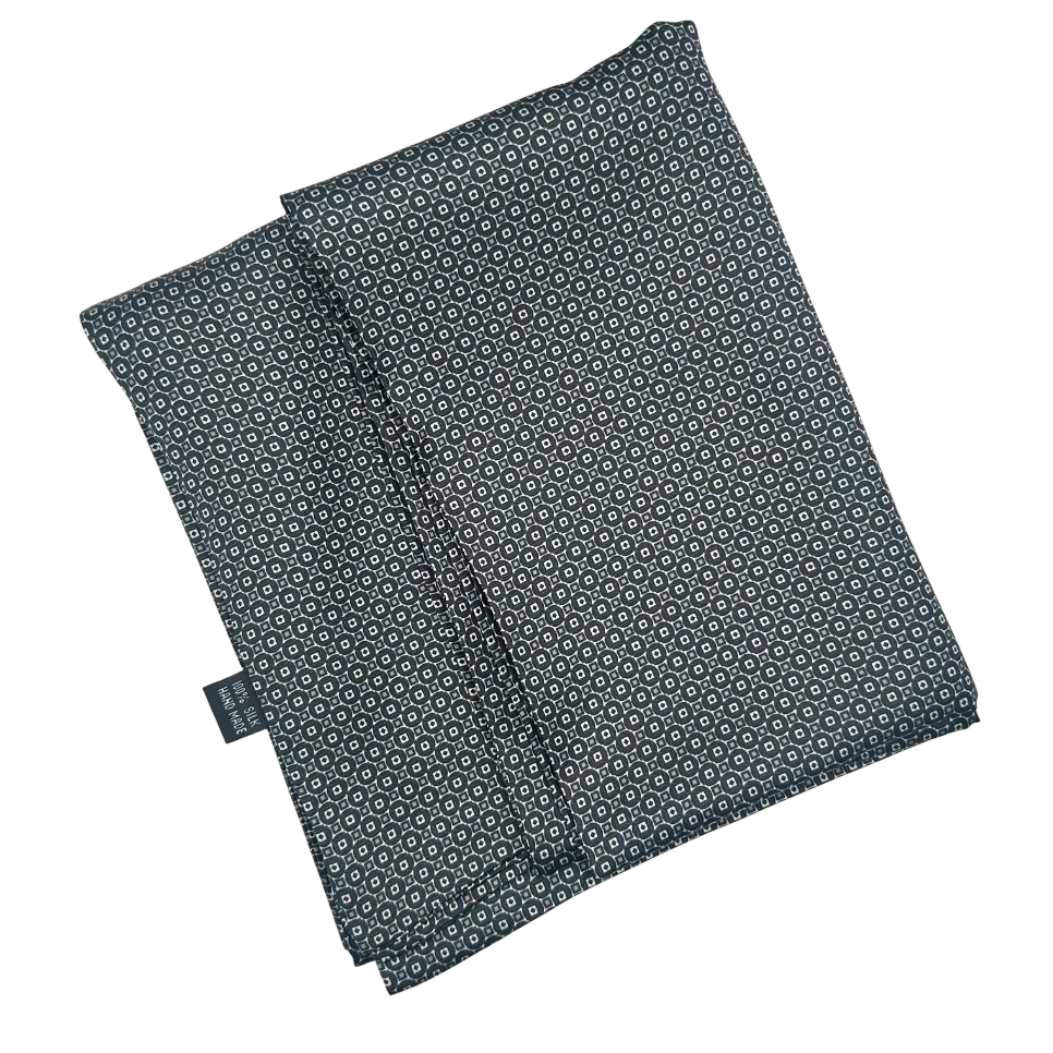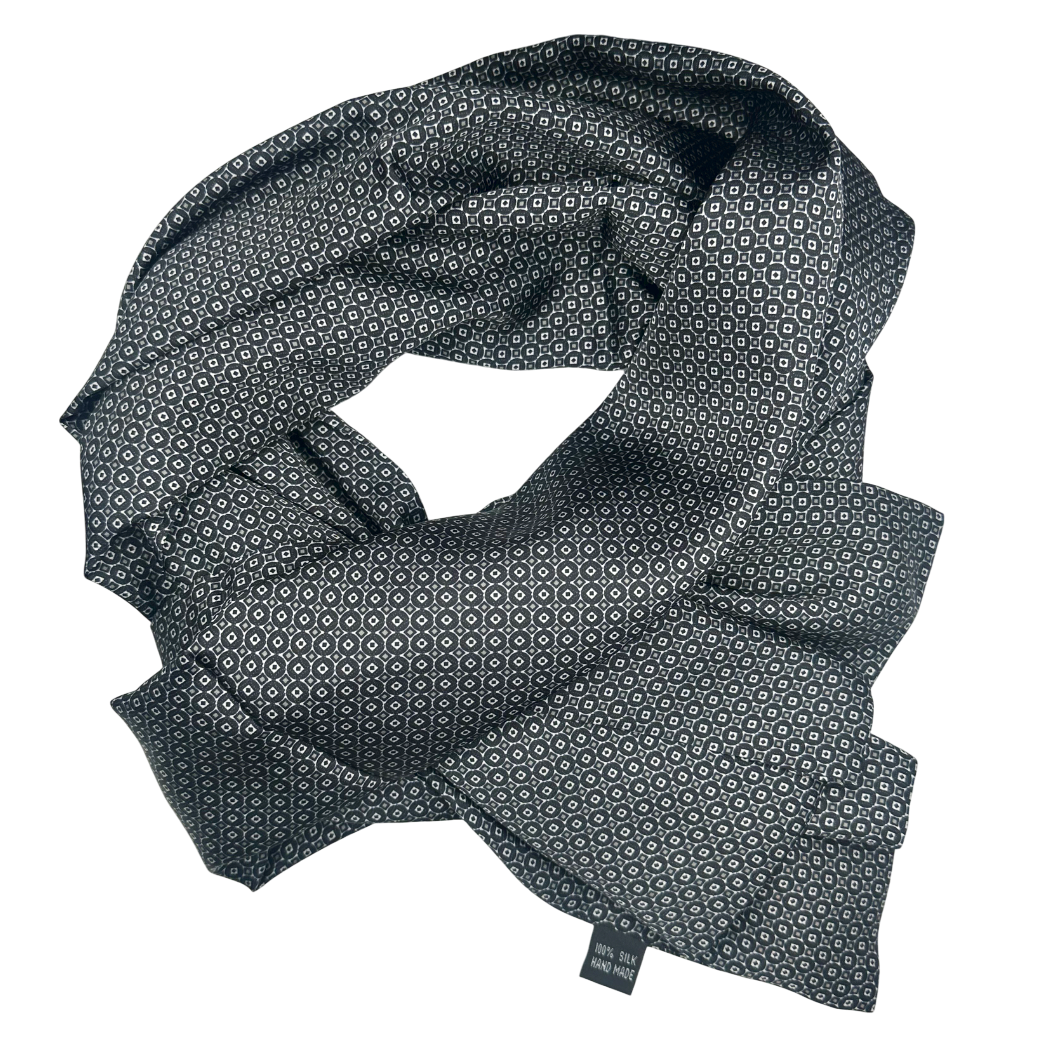 Eșarfă elegantă pentru bărbați, confecționată din material fin de calitate superioară, în nuanță gri inchis cu imprimeu geometric alb.