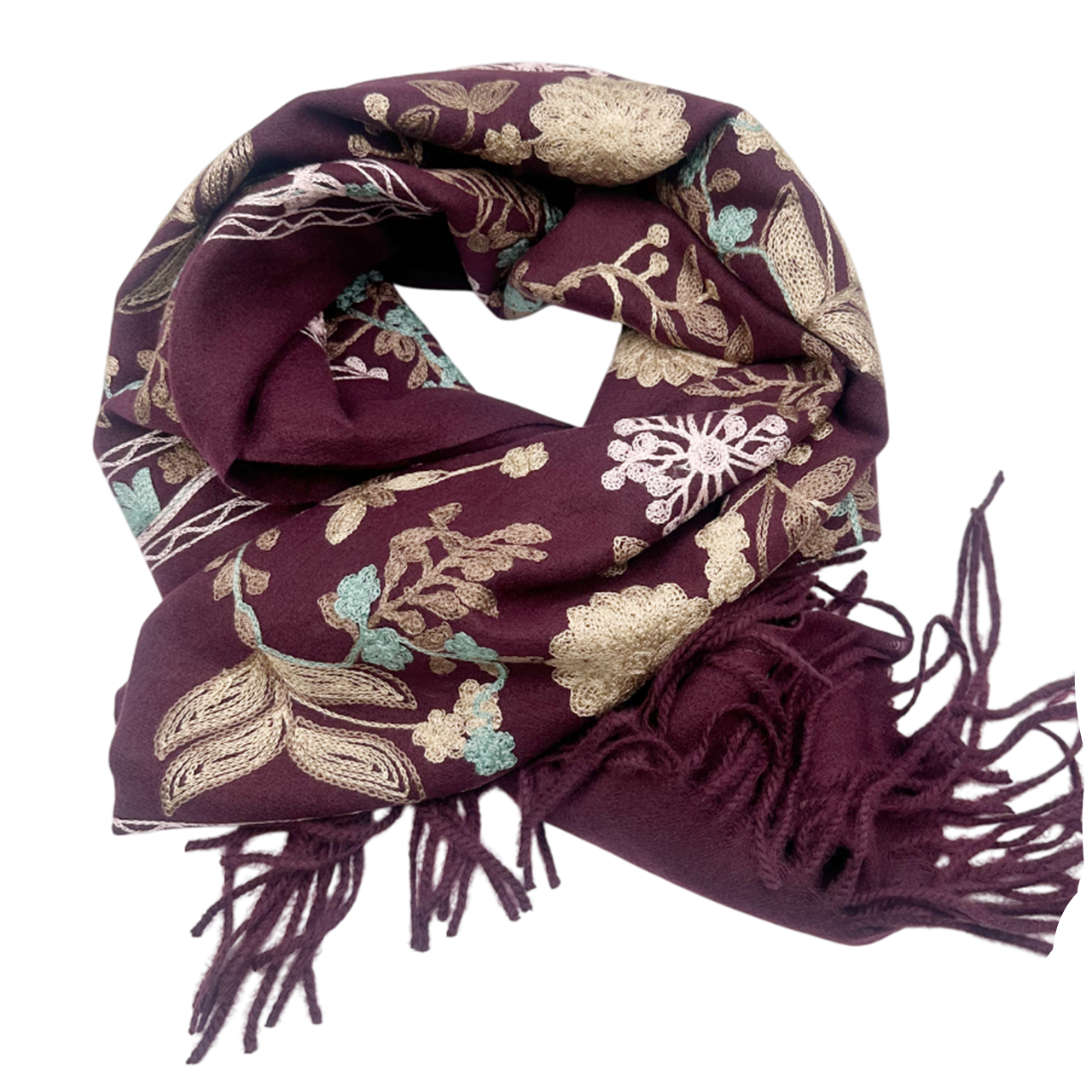 Esarfa tip Poncho cu broderie si franjuri Cashmere CHLOE, Mov sangria