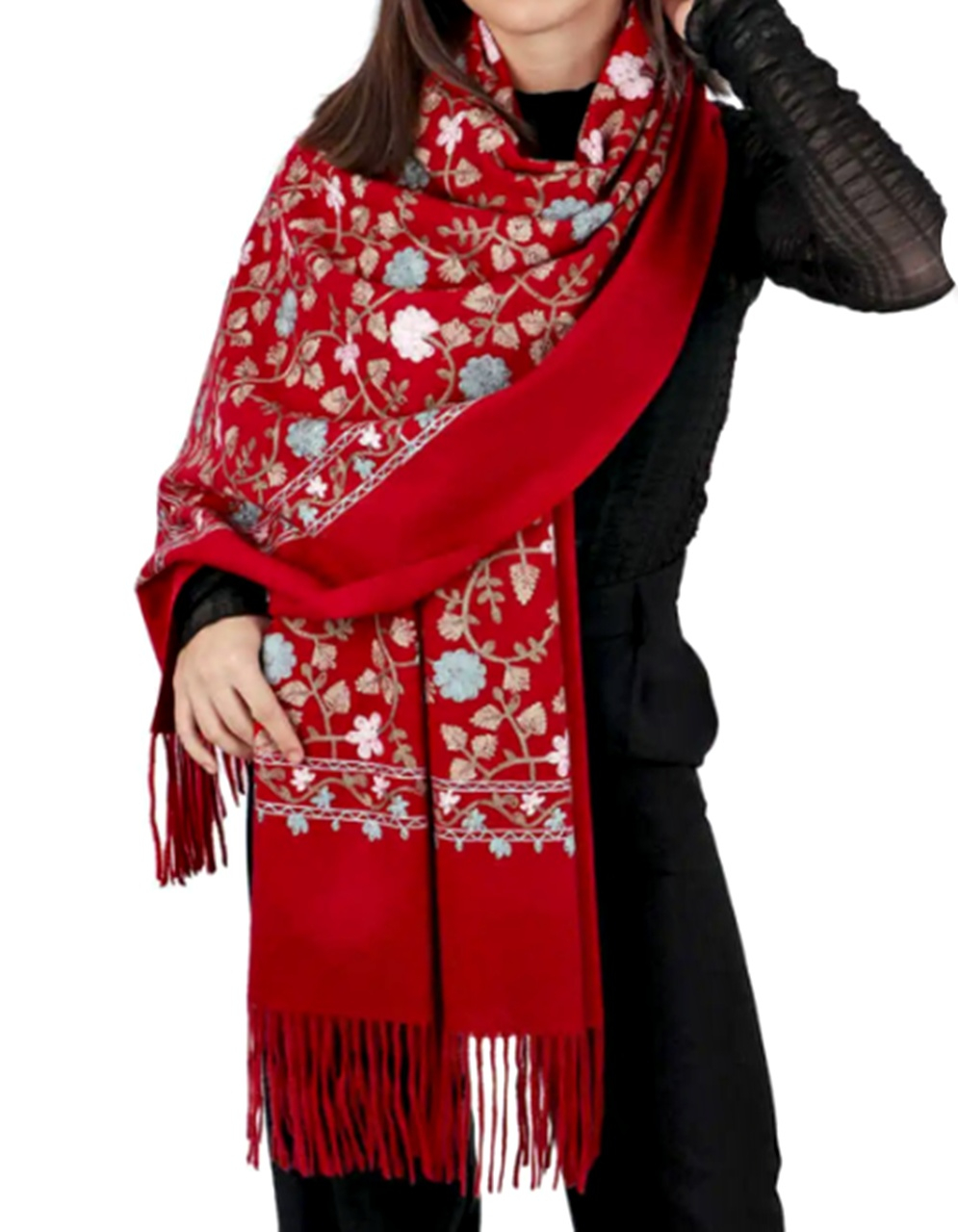Esarfa tip Poncho cu broderie si franjuri Cashmere CHLOE, Rosu