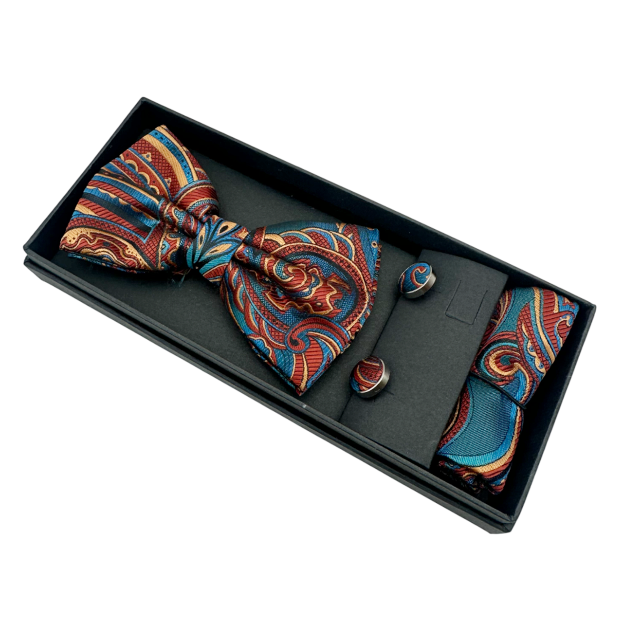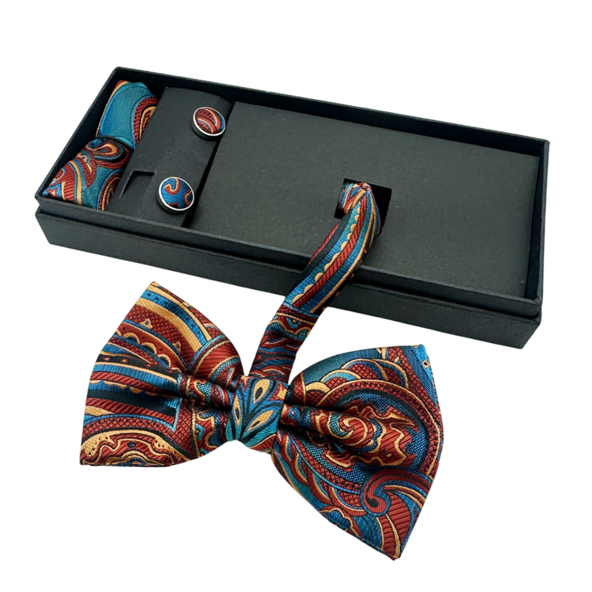 Papion albastru-caramiziu cu model, JERRY, Set cu butoni si batista